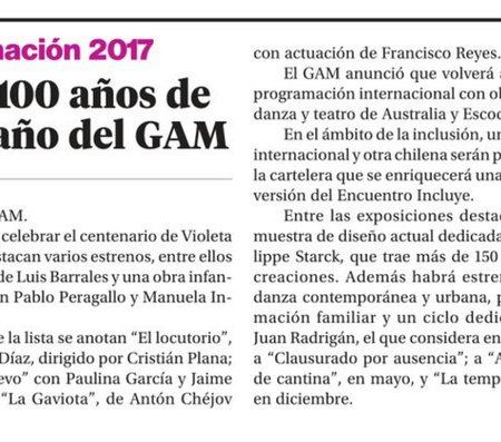 El 2017 se presentan 45 creaciones de artes escénicas, siete de ellas producciones y coproducciones GAM. Para celebrar el centenario de Violeta Parra se programaron estrenos, entre los que destaca un texto de Luis Barrales y una obra infantil de Juan Pablo Peragallo y Manuela Infante. También resalta El locutorio, de Jorge Díaz, dirigido por Cristián Plana; Año nuevo con Paulina García y Jaime Lorca, y La Gaviota, de Antón Chéjov con actuación de Francisco Reyes.