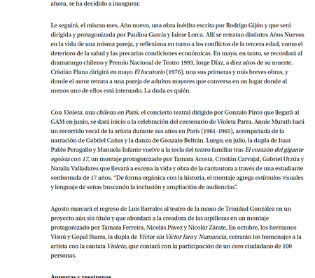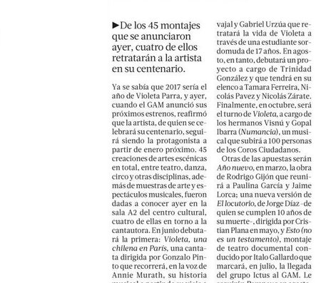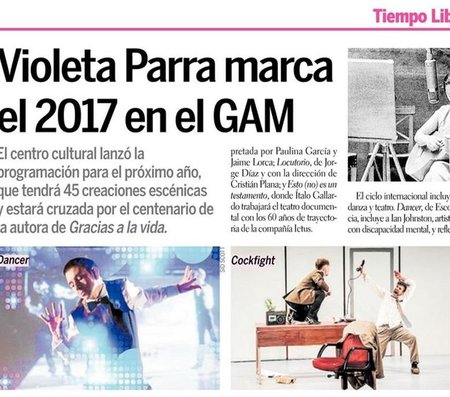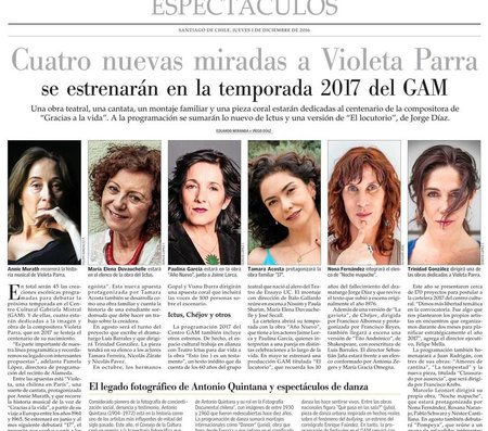 Serán 41 producciones nacionales de artes escénicas que se presentarán el próximo año. Se suman además obras internacionales de Escocia y Australia, exposiciones, festivales, ciclos y programación especial para fomentar la inclusión en las artes. Los ejes que cruzarán la programación el 2017 serán el centenario del nacimiento de Violeta Parra, Memoria y Utopías y una línea dedicada a nuestras raíces.