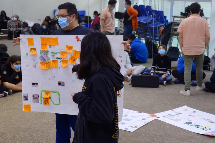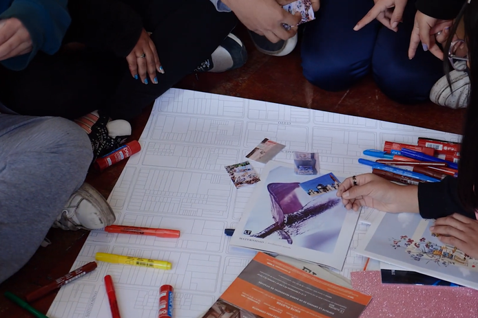 Finalmente, el tercer día se realiza la “Cartografía Constituyente”, donde los y las estudiantes elaboran un mapa a escala de los hitos que estan en sus barrios y caminos a los liceos. La idea es dejar fluir la creatividad, por lo que pueden utilizar lápices, plumones, recortes, stickers, lanas, entre otros. Además, se les entregan algunas de las fotografías impresas que tomaron el día anterior para que también las puedan ubicar en el mapa. El objetivo es cerrar el proceso de una manera visual y tangible para los participantes bajo sus ideas y mirada.