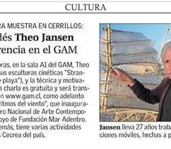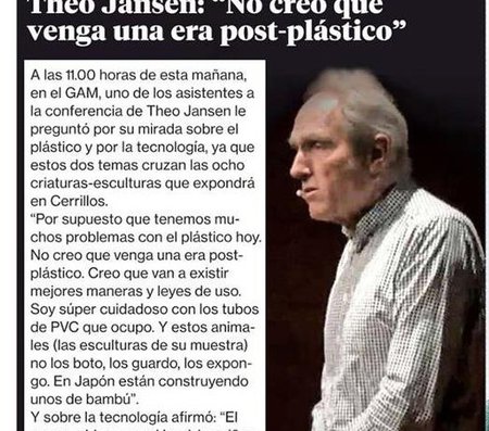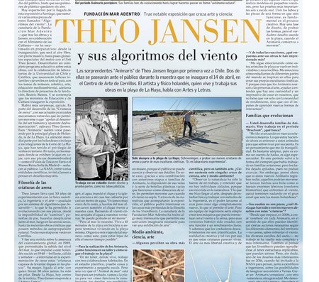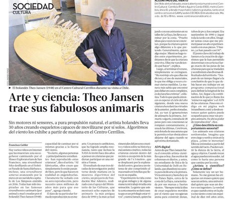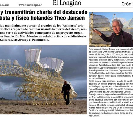Antes de inaugurar su esperada exposición en el Centro Nacional de Arte Contemporáneo Cerrillos, el destacado artista holandés Theo Jansen hablará en GAM de creación, medio ambiente, naturaleza, evolución, azar y matemáticas. La conferencia organizada por Fundación Mar Adentro y GAM también se transmitirá en vivo gracias a Mediastream.