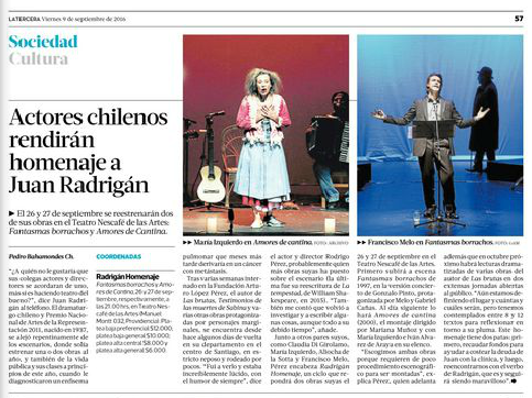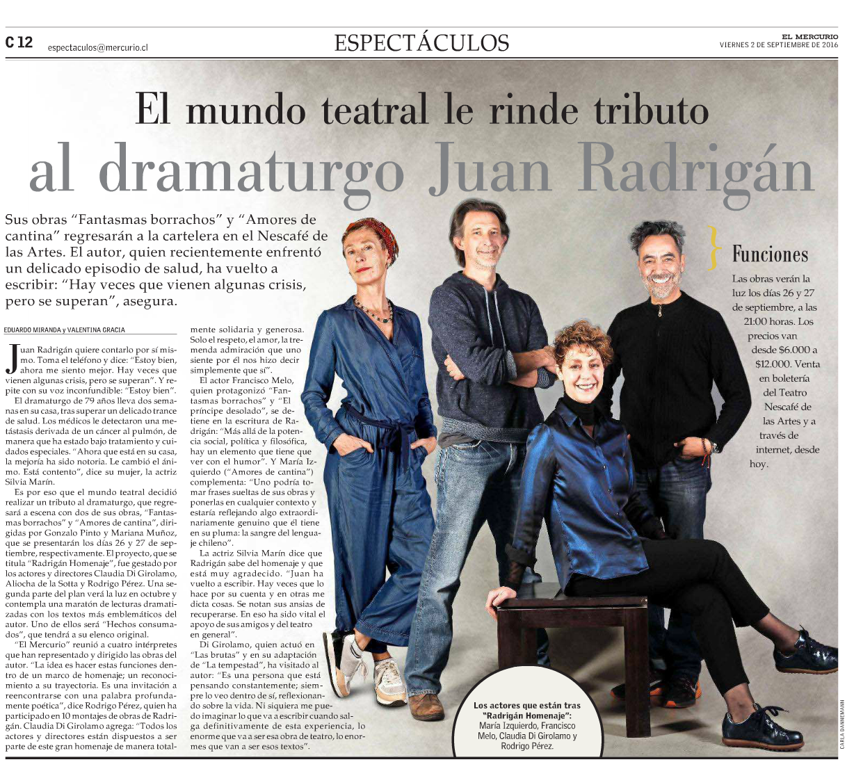 El 26 y 27 Sep, dos de sus textos más emblemáticos retornarán a las tablas con Radrigán Homenaje: una reposición de sus obras Fantasmas borrachos y Amores de cantina, que organizó un grupo de actores nacionales entre los que están Claudia Di Girolamo, María Izquierdo, Rodrigo Pérez, Francisco Melo y Aliocha de la Sotta.