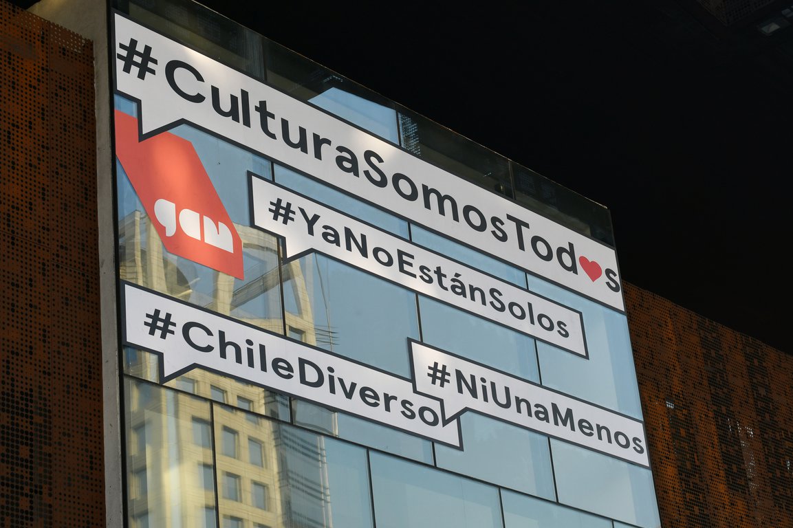 Niños acompañados, diversidad e inclusión y no más femicidios, son las tres banderas que el centro cultural GAM decidió destacar en su fachada que mira a la Alameda. Desde el viernes 4 de agosto, los transeúntes podrán leer el mensaje “Cultura somos todos”, con las campañas alusivas a “Lo niños ya no están solos”, “Ni una menos” y “Chile diverso”.