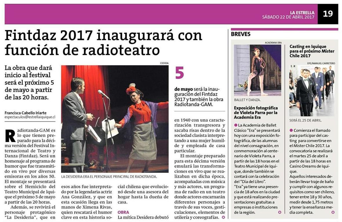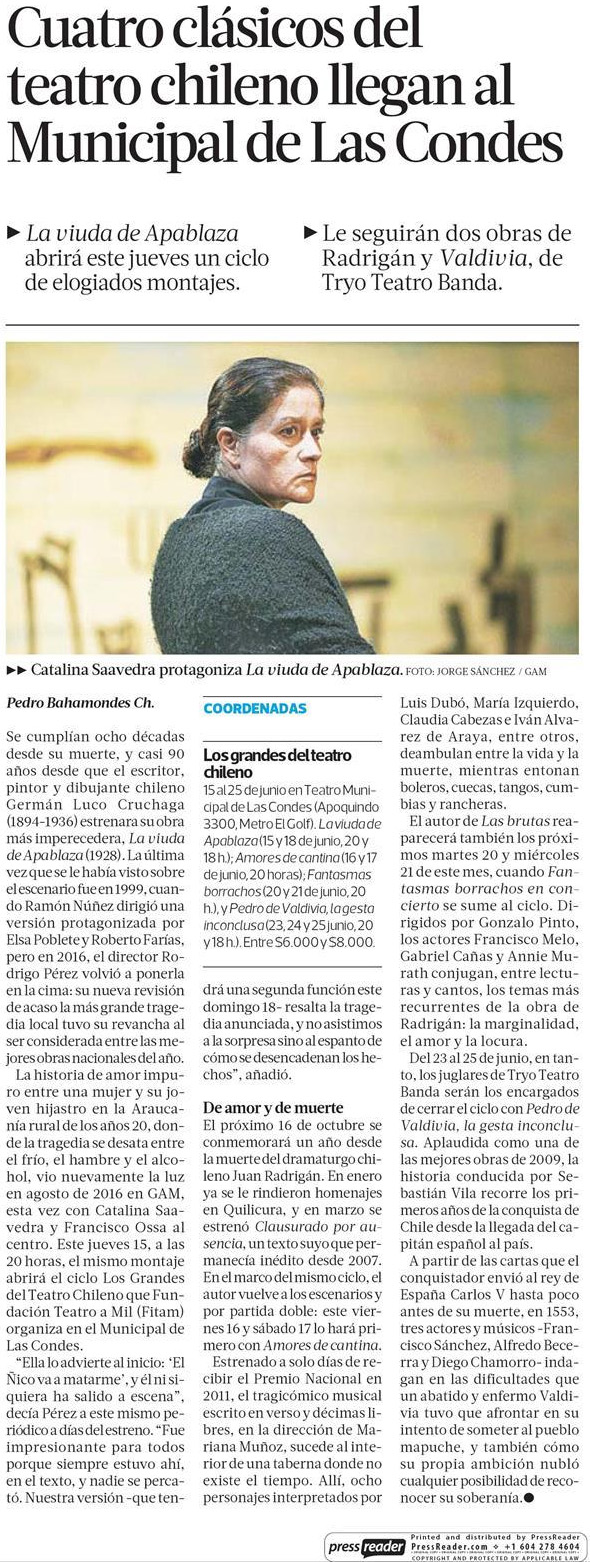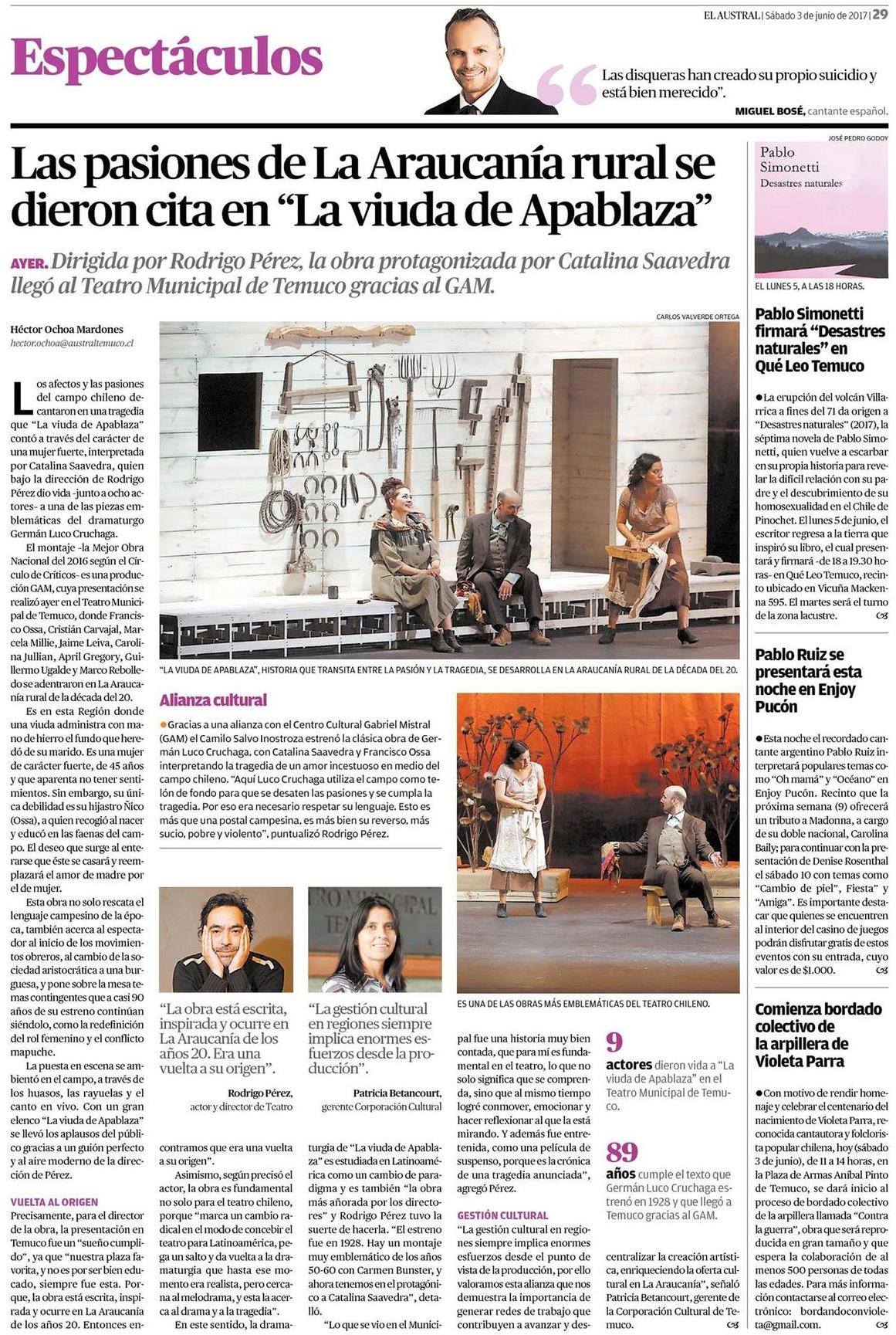 Luego de una exitosa función de Amores de cantina en la Plaza Sotomayor de Valparaíso y de Radiotanda-GAM en el Festival Internacional de Teatro y Danza de Iquique FINTDAZ 2017, llegan dos producciones GAM al Teatro Municipal de Temuco: La Viuda de Apablaza (2 de junio) y Xuárez (23 de junio). Por su parte, La noche obstinada viajará a la ciudad puerto para realizar una función el sábado 8 de julio en el Parque Cultural de Valparaíso.