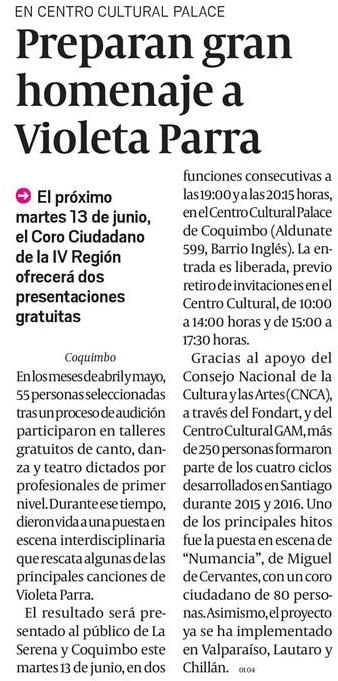 También en junio, el proyecto Coros Ciudadanos viajará a regiones con un ciclo que conmemora los 100 años del nacimiento de Violeta Parra. El sábado 3 de junio se presentará en el Teatro Regional de Rancagua y el martes 13 de junio en el Centro Cultural Palace de Coquimbo.