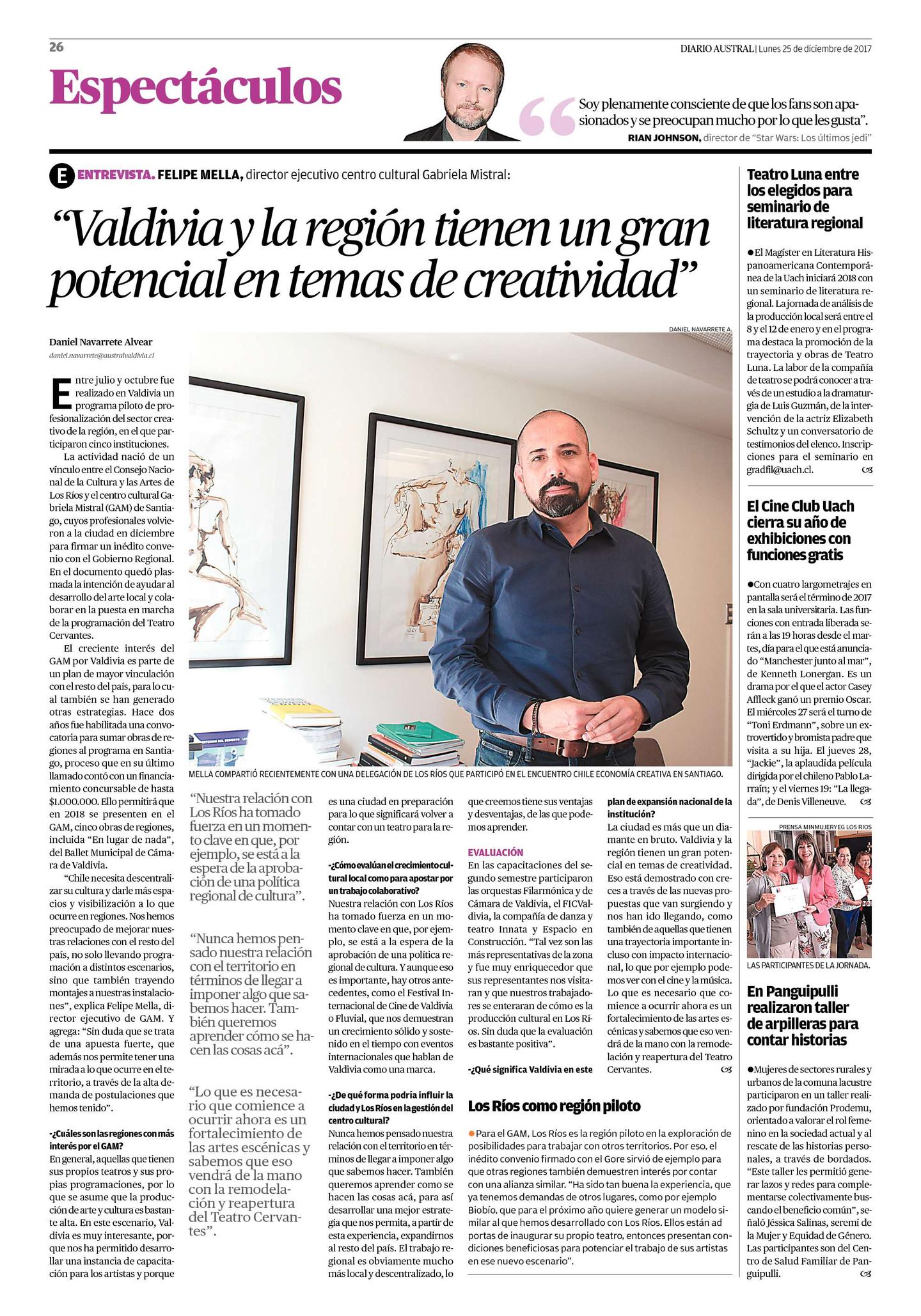 Diario Austral de Valdivia, 25 de diciembre 2017, entrevista a Felipe Mella.