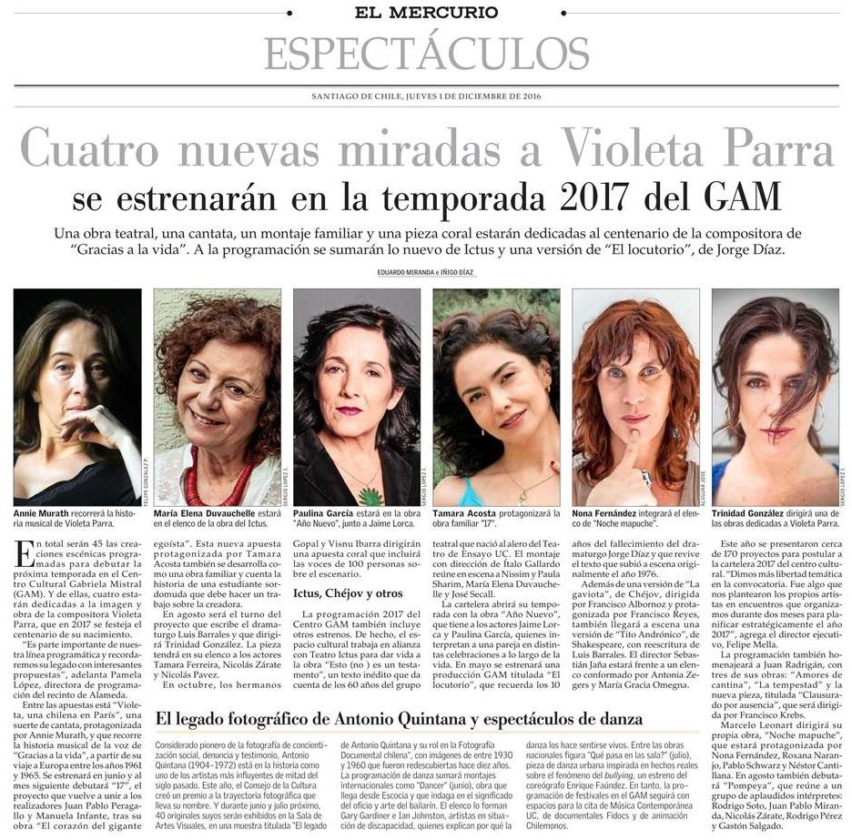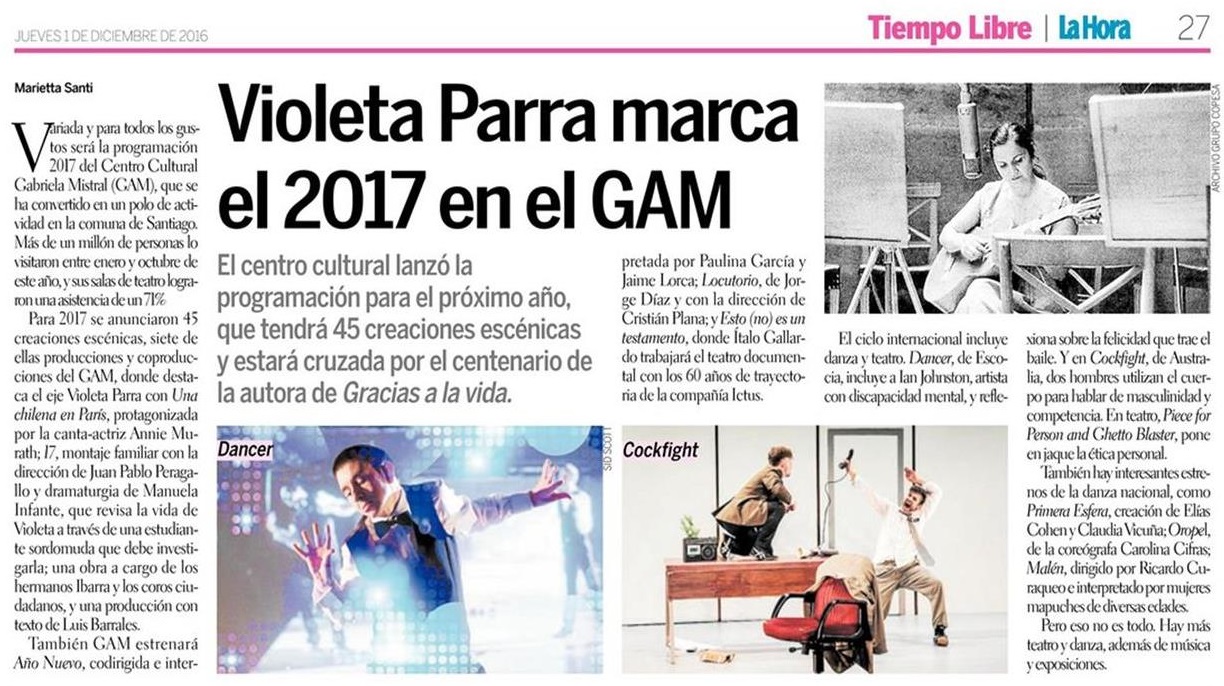Serán 41 producciones nacionales de artes escénicas que se presentarán el próximo año. Se suman además obras internacionales de Escocia y Australia, exposiciones, festivales, ciclos y programación especial para fomentar la inclusión en las artes. Los ejes que cruzarán la programación el 2017 serán el centenario del nacimiento de Violeta Parra, Memoria y Utopías y una línea dedicada a nuestras raíces.