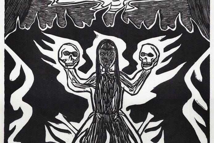 El teléfono suena en la casa del Presidente. Su amante llora. Hawker Hunter bombardea La Moneda. Allende se suicida. Arrojan cuerpos desde el aire. Un ojo mutilado. Derechos Humanos. Grafito y tinta.