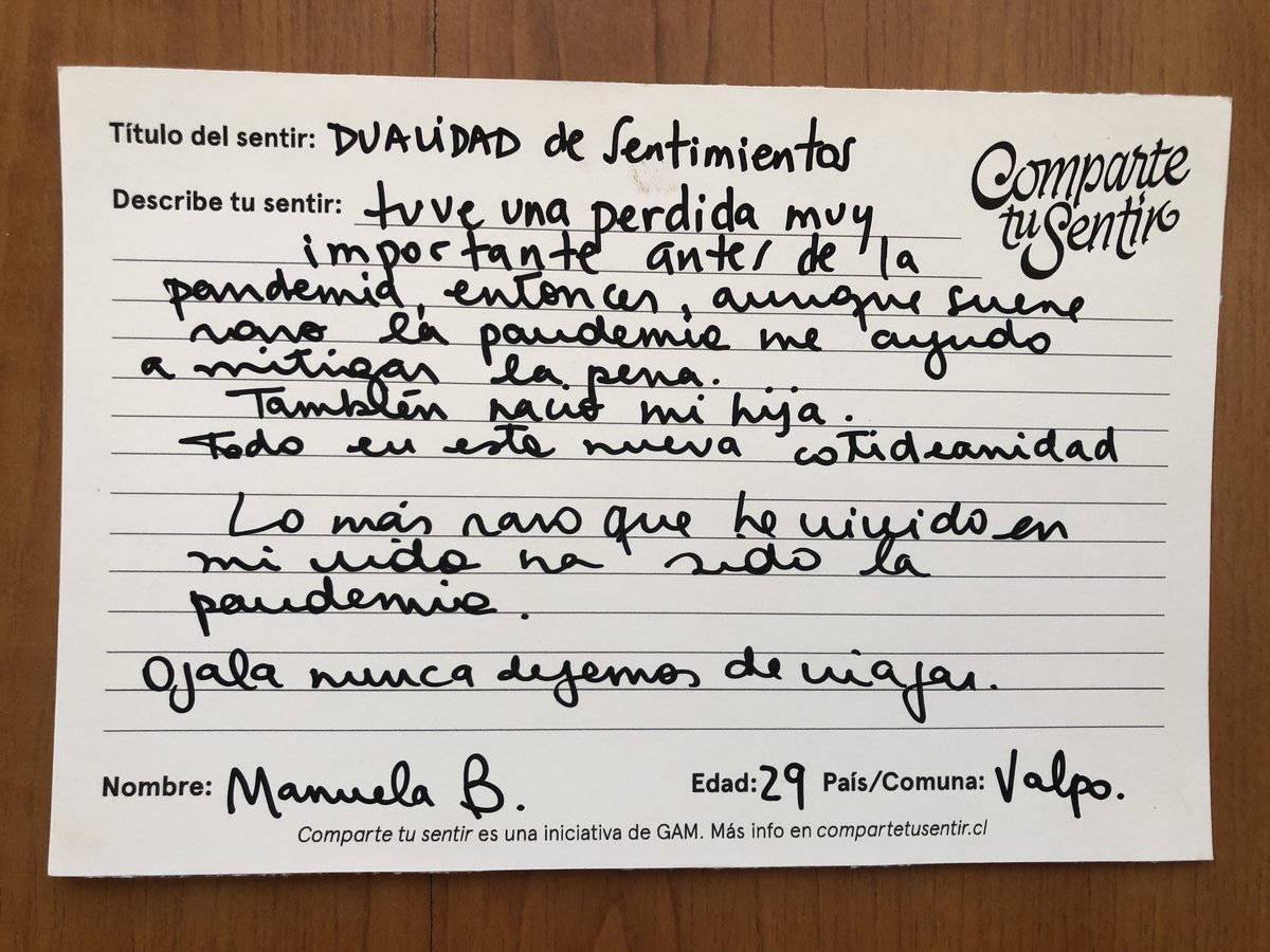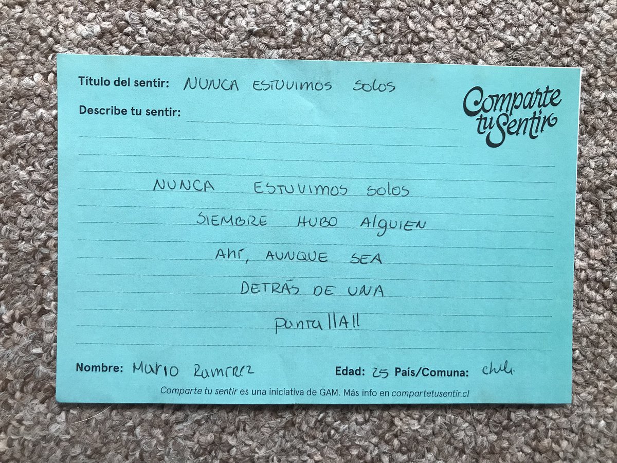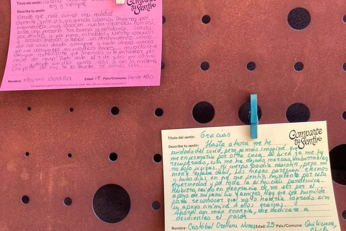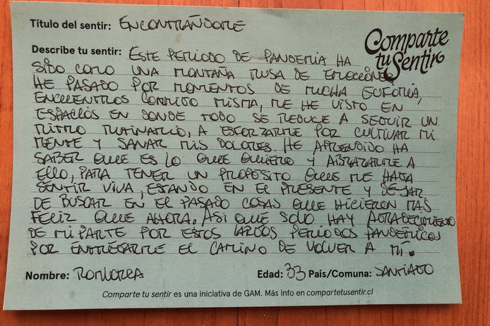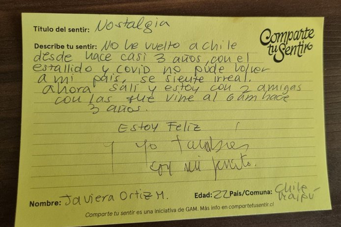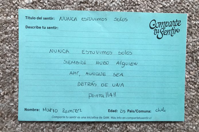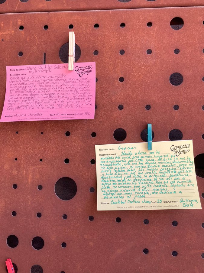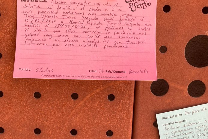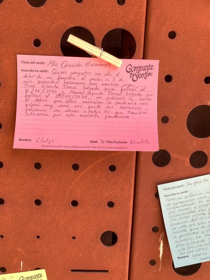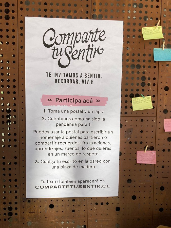 La iniciativa, que nació en septiembre de 2021 en formato digital, tiene su versión en presencial con una intervención en el edificio GAM para que puedas dejar tus dibujos, pensamientos y memorias desde tu puño y letra. Utilizando las medidas de seguridad y protocolo COVID, te invitamos a participar usando un papel para escribir un homenaje a quienes partieron o compartir recuerdos, frustraciones, aprendizajes, sueños, lo que quieras en un marco de respeto. Podrás colgar tu escrito en la pared con una pinza de madera y tu texto también aparecerá en compartetusentir.cl.