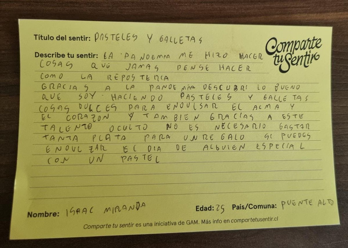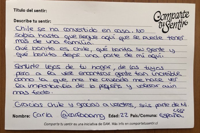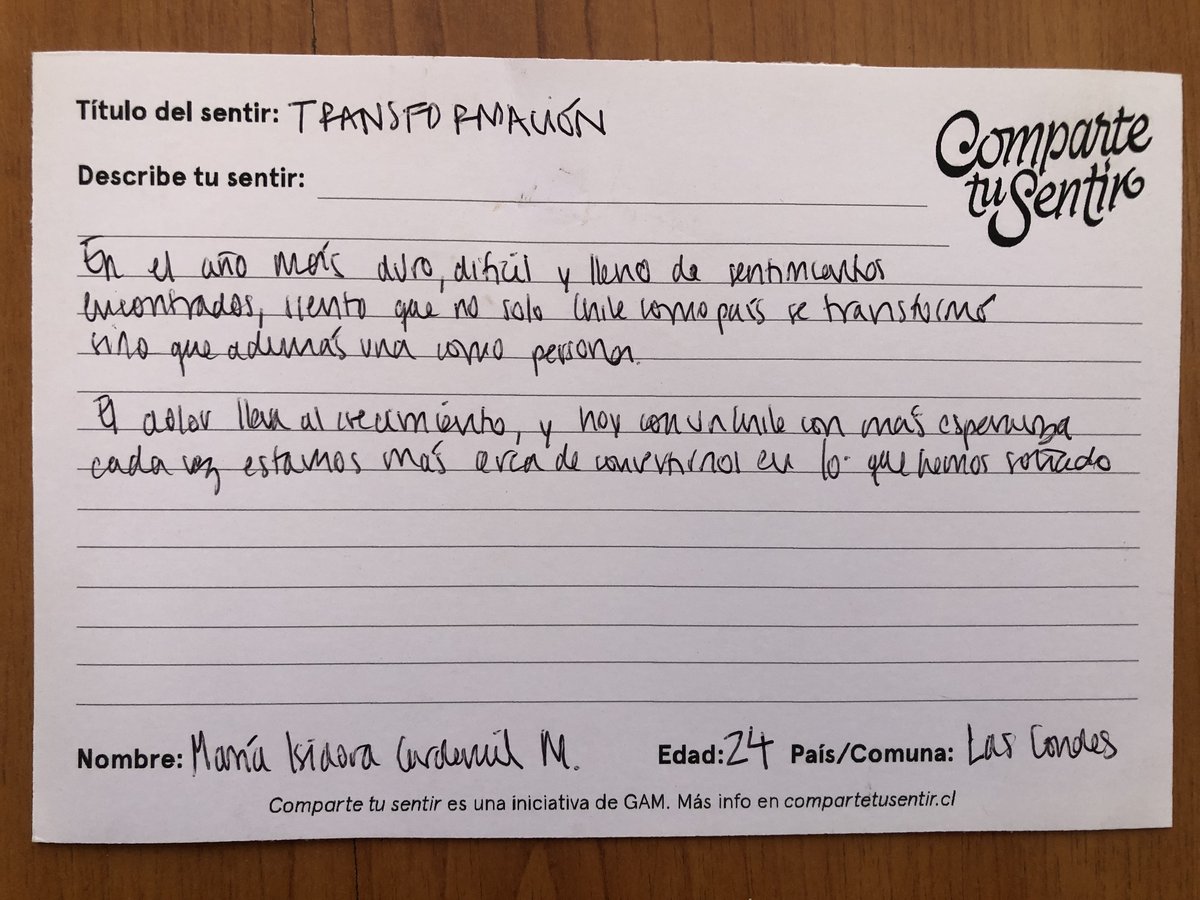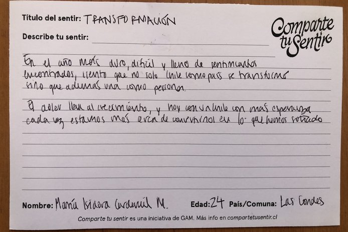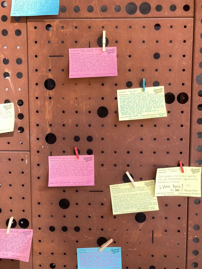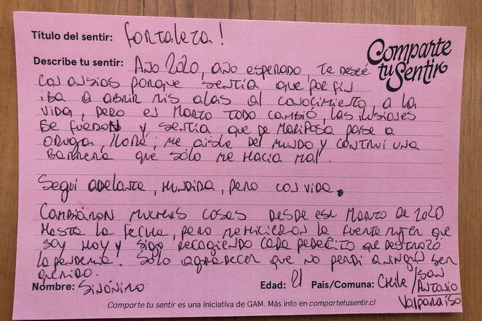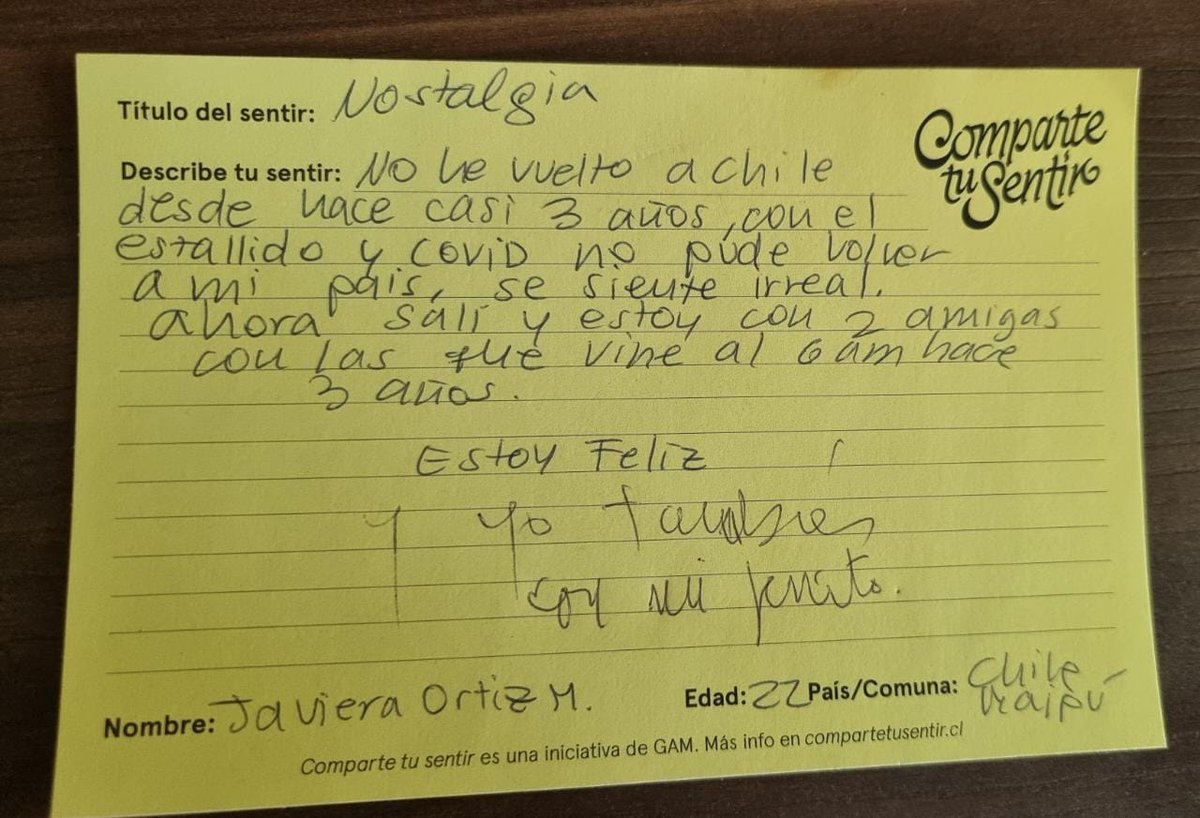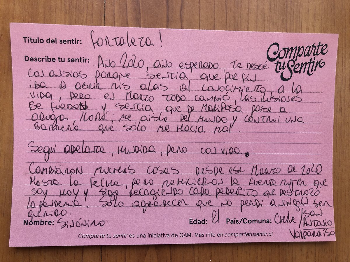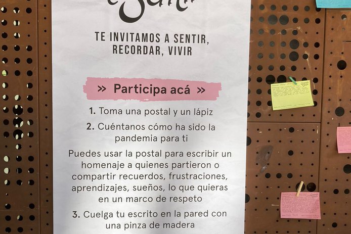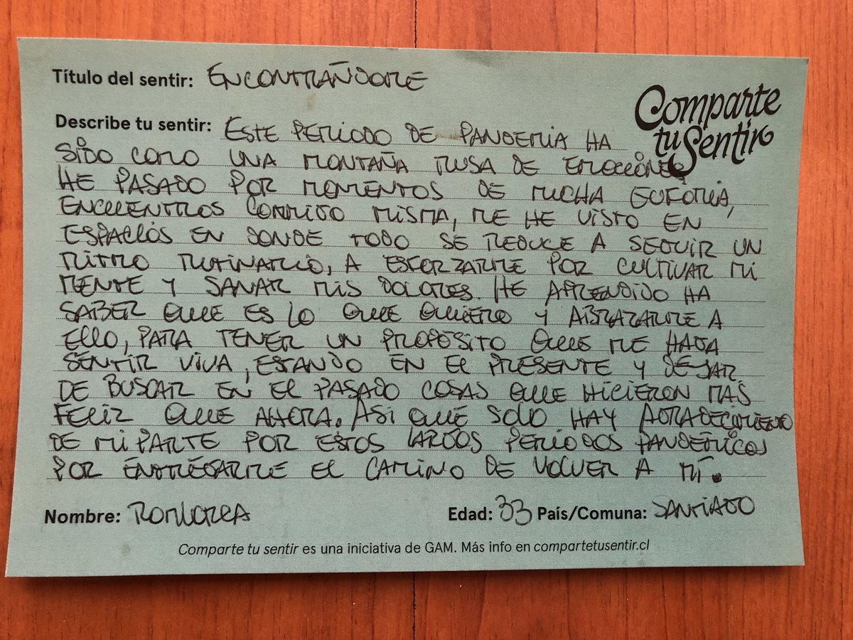 La iniciativa, que nació en septiembre de 2021 en formato digital, tiene su versión en presencial con una intervención en el edificio GAM para que puedas dejar tus dibujos, pensamientos y memorias desde tu puño y letra. Utilizando las medidas de seguridad y protocolo COVID, te invitamos a participar usando un papel para escribir un homenaje a quienes partieron o compartir recuerdos, frustraciones, aprendizajes, sueños, lo que quieras en un marco de respeto. Podrás colgar tu escrito en la pared con una pinza de madera y tu texto también aparecerá en compartetusentir.cl.