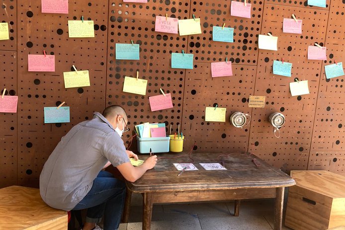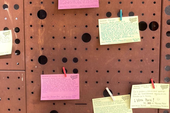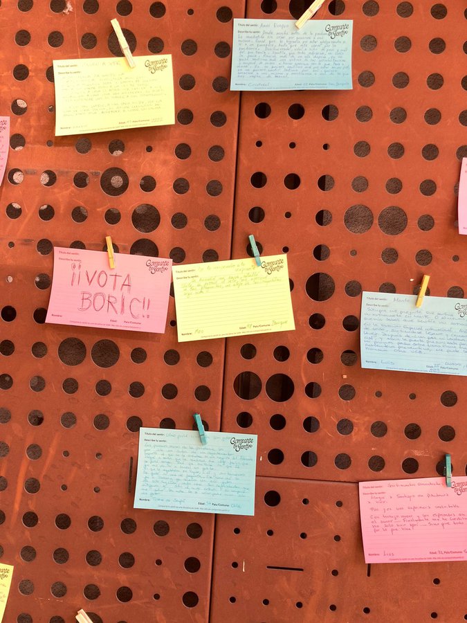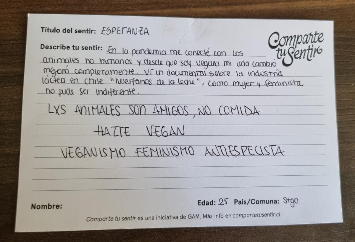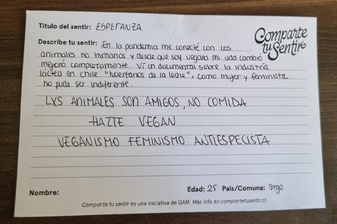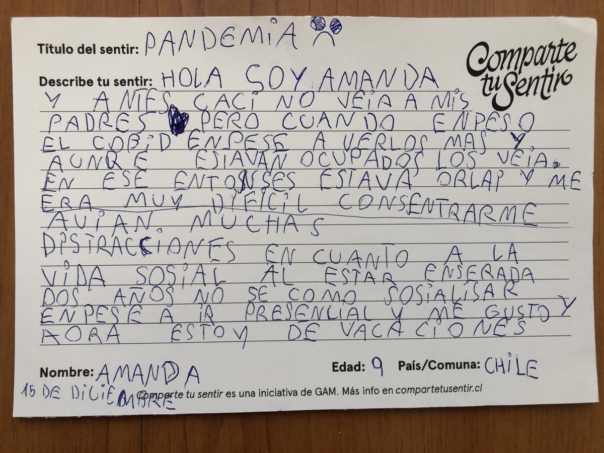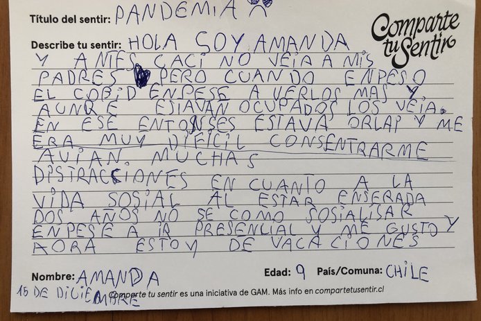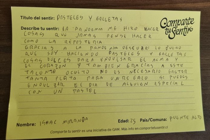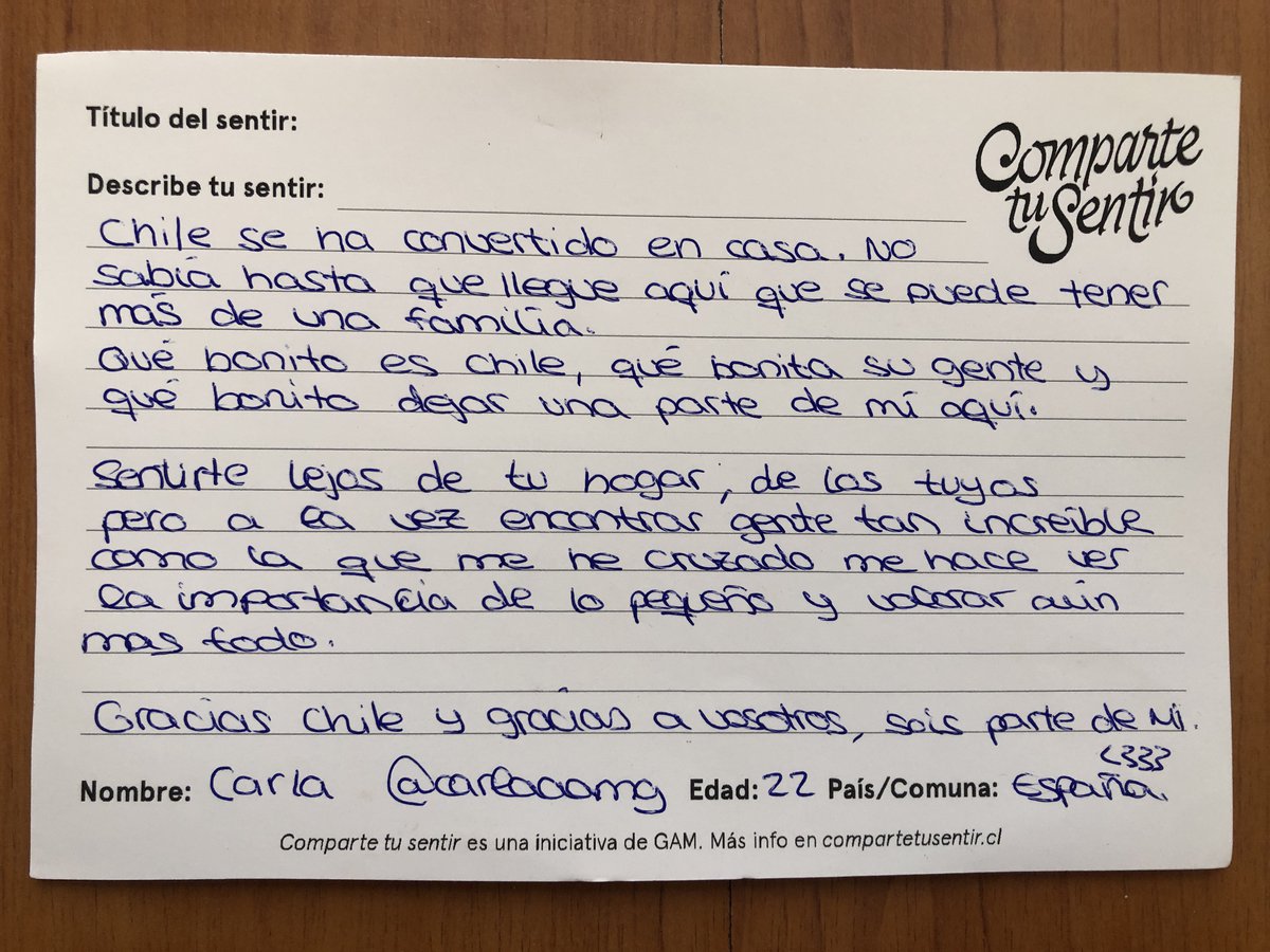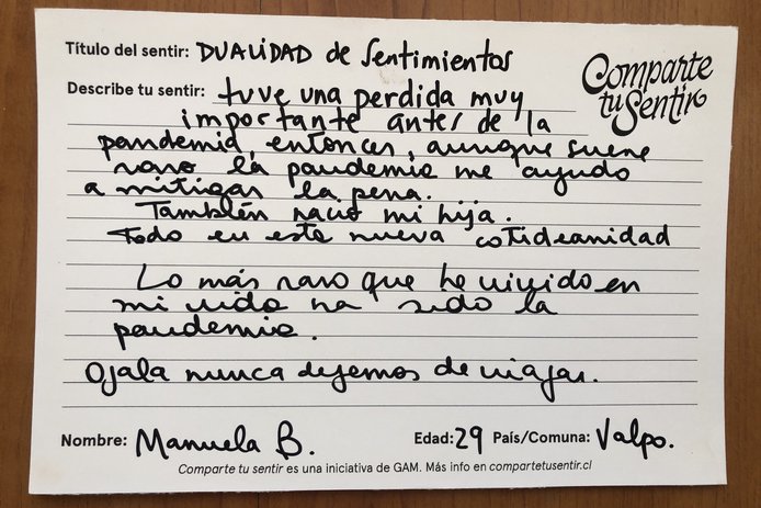 La iniciativa, que nació en septiembre de 2021 en formato digital, tiene su versión en presencial con una intervención en el edificio GAM para que puedas dejar tus dibujos, pensamientos y memorias desde tu puño y letra. Utilizando las medidas de seguridad y protocolo COVID, te invitamos a participar usando un papel para escribir un homenaje a quienes partieron o compartir recuerdos, frustraciones, aprendizajes, sueños, lo que quieras en un marco de respeto. Podrás colgar tu escrito en la pared con una pinza de madera y tu texto también aparecerá en compartetusentir.cl.