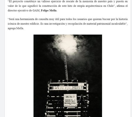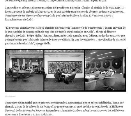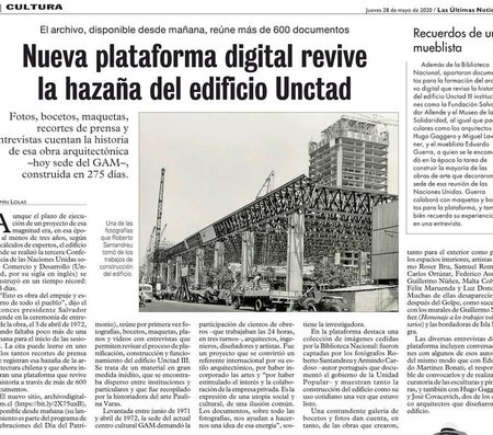 El "Archivo Digital de Arte y Arquitectura de la UNCTAD III", es una plataforma online que reúne más de 600 documentos que recrean la construcción de nuestro icónico edificio en 1972, llamado en ese entonces UNCTAD III. Habrá material audiovisual, maquetas, entrevistas y muchísimas fotografías que mostrarán el backstage de nuestro edificio en una plataforma completamente gratuita. Todos los materiales fueron rescatados de instituciones como la Fundación Salvador Allende, la Fundación Félix Maruenda y colecciones personales de artistas.