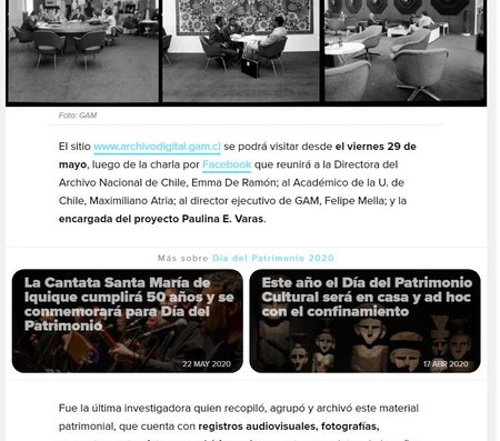 Celebremos el Día del Patrimonio en casa con una conversación en Facebook GAM sobre archivos y memoria a propósito del Lanzamiento del “Archivo Digital de Arte y Arquitectura de la UNCTAD III”. Participan destacados gestores culturales, arquitectos, archivistas y académicos ligados al arte y patrimonio. ¡Te esperamos desde donde estés!