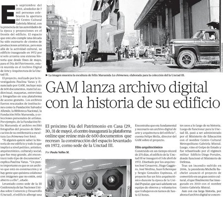 En el marco de la conmemoración del Día del Patrimonio Nacional en Casa, el próximo viernes 29 de mayo se realizará un conversatorio para inaugurar el “Archivo Digital de Arte y Arquitectura de la UNCTAD III”, una plataforma de consulta pública, de acceso gratuito, que busca rescatar la memoria nacional y relevar el patrimonio del edificio que hoy alberga GAM.
