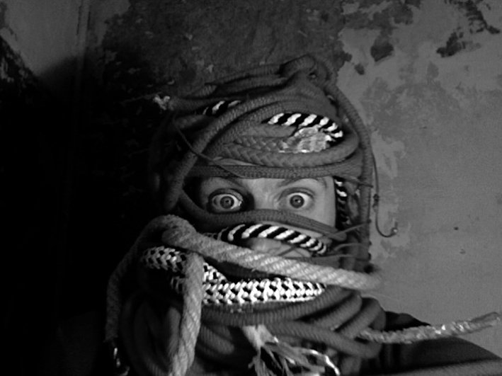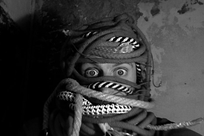 Un mismo ingrediente puede servir para cocinar muchas cosas. En esta obra el elemento central son las cuerdas, como dice el título. Con ellas el danés Karl Stets crea desde animales, como víboras y peces, hasta un camino: la famosa cuerda floja.
