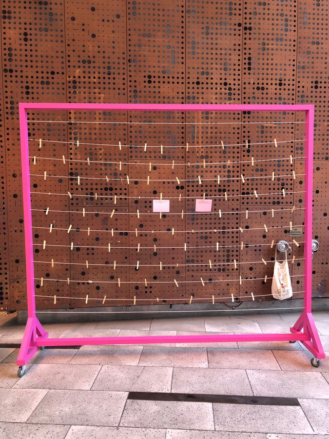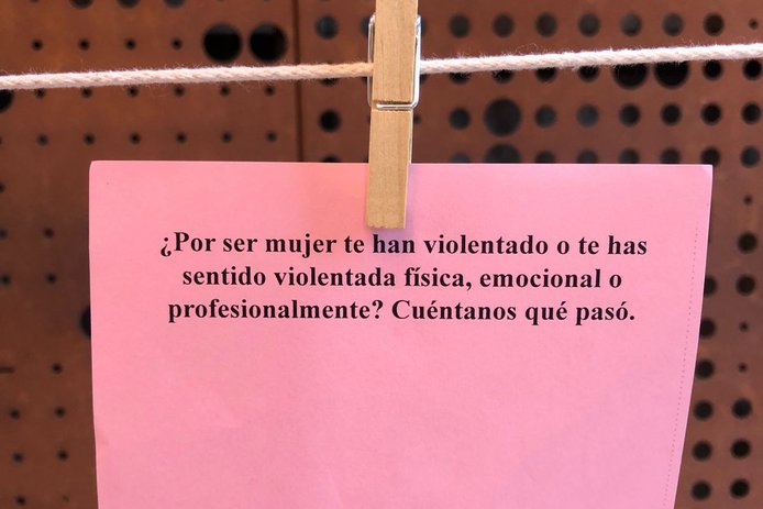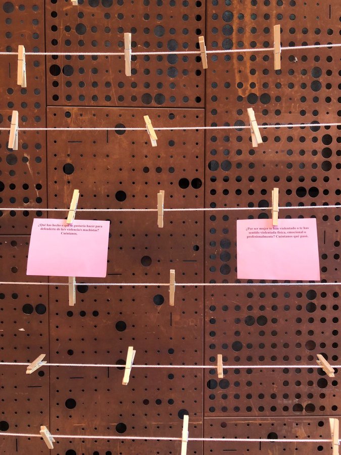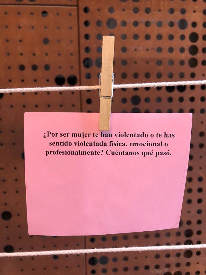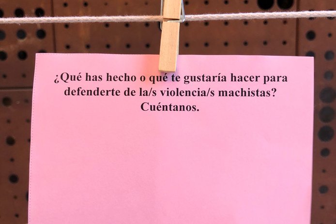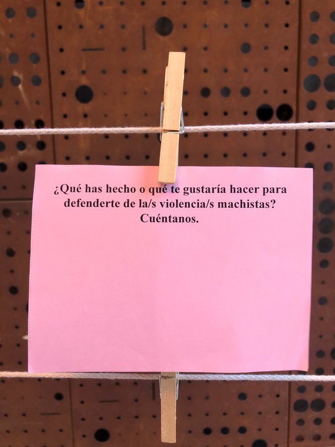 ¿Por ser mujer te han violentado o te has sentido violentada física, emocional o profesionalmente? Cuéntanos qué pasó, ¿qué has hecho o qué te gustaría hacer para defenderte de la/s violencia/s machistas? Cuéntanos. Posterior a ello, cada participante cuelga el papel con su respuesta en el Tendedero para que participe junto al resto de las respuestas, creando una obra colectiva que visibiliza la violencia hacia las mujeres.