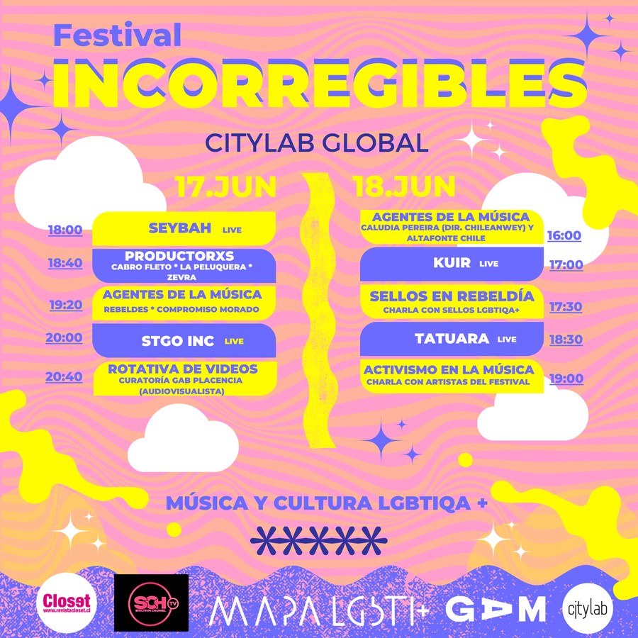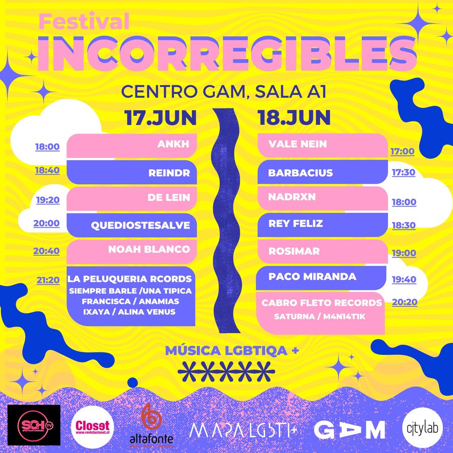 Durante junio se celebra el mes del orgullo, en el marco de este hito se realiza por primera vez el Festival Incorregibles. Un encuentro que reúne una nutrida cartelera de conciertos, donde se presentarán 20 artistas nacionales LGBTIQA+. Además de una feria de editoriales y artes gráficas, instalaciones artísticas, performances, charlas, stands informativos y talleres que tendrán cita durante dos días en plaza central, la Sala A1 y en el espacio Citylab.