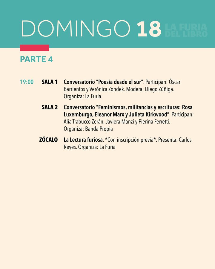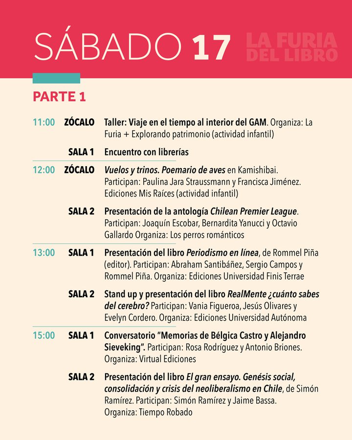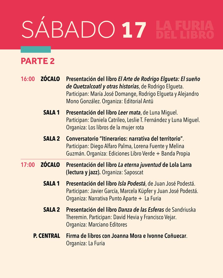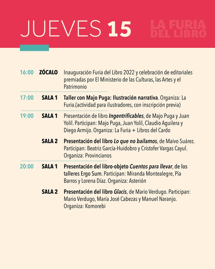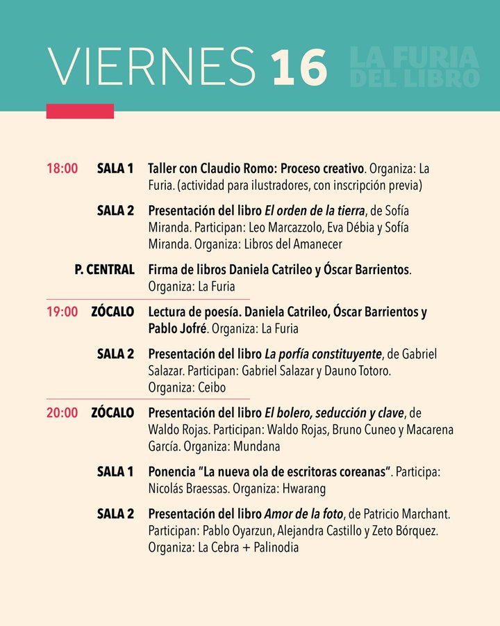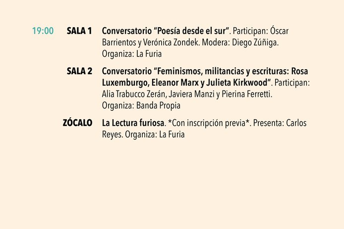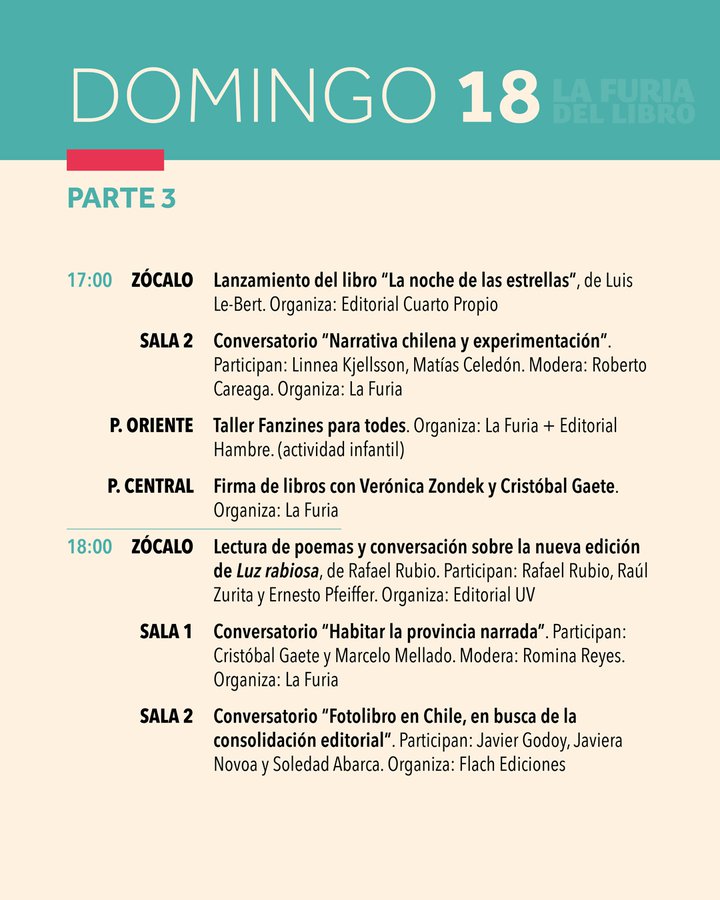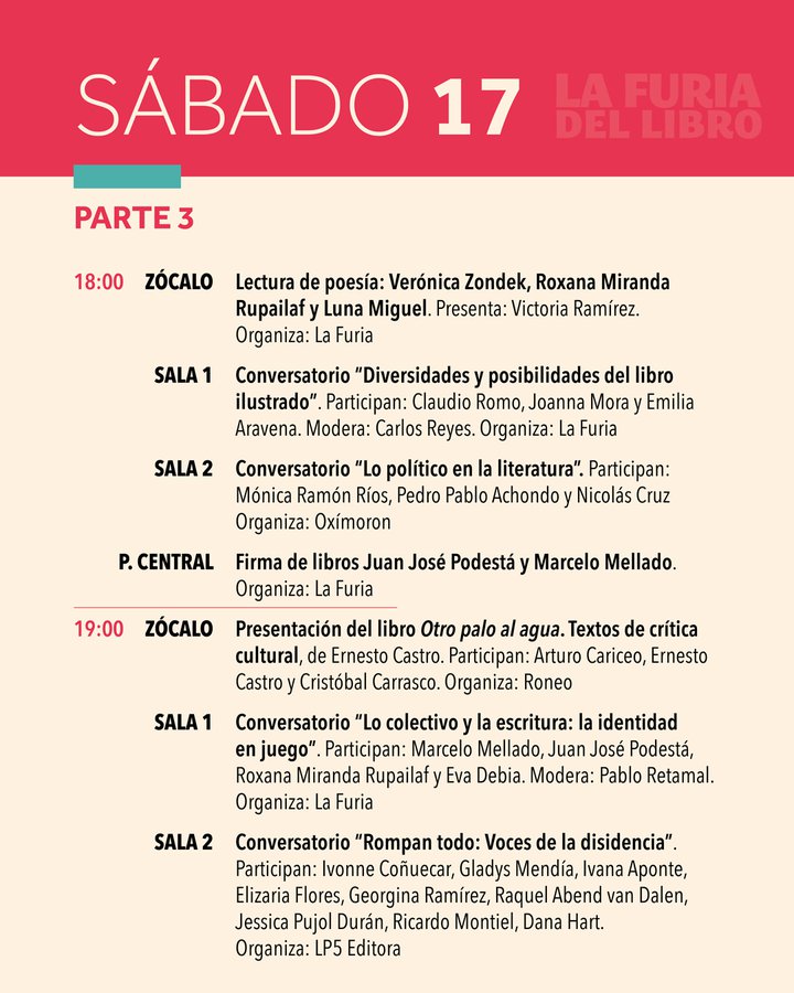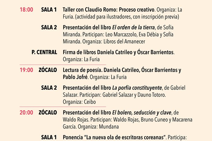 Dentro de los conversatorios destacan el de Daniela Catrileo, Ivonne Coñuecar y Roxana Miranda Rupailaf, quienes dialogarán en "Imaginarios mapuche en la narrativa chilena", y “Habitar la provincia”, en el que Marcelo Mellado y Cristóbal Gaete reflexionarán sobre la escritura desde regiones. La instancia también tendrá actividades familiares como la presentación de poesía infantil junto a Verónica Zondek y su libro Hola ratón con cola (Ediciones Libros del Cardo)