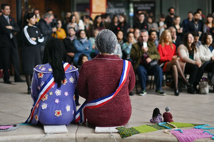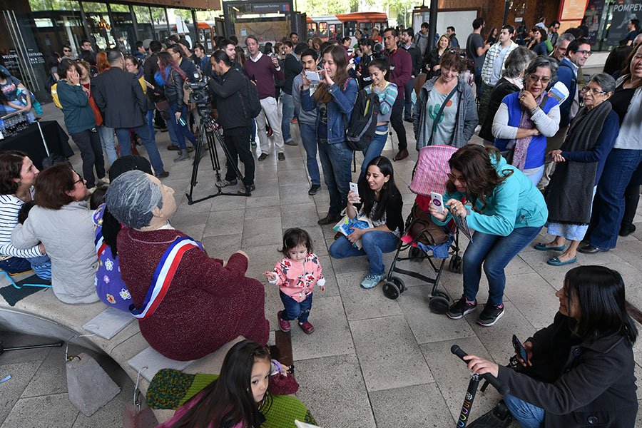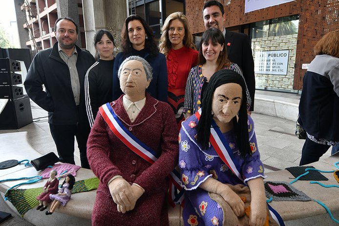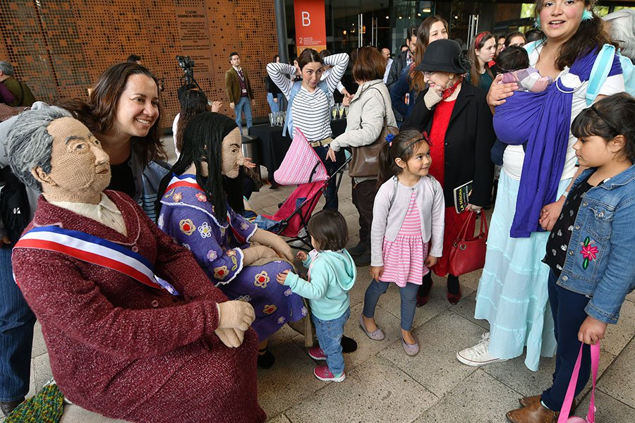 Tejidas a crochet y palillo por la artista Macarena Ahumada, las figuras serán las nuevas anfitrionas del centro cultural. Sentadas en su plaza central, esperan desde hoy interactuar con los visitantes. Las acompañará una edición del Artes y Letras de El Mercurio, impreso en tela, donde se revela una candente entrevista y respuestas reales declaradas por ellas en canciones, décimas, libros y textos.