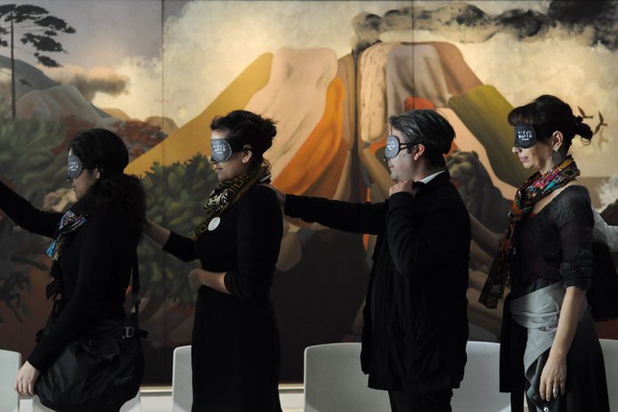 Una persona que se enfrenta a una obra de arte normalmente se para frente a ella, la mira y se va. ¿Pero qué pasa si esa persona no la puede o no la quiere ver? Entonces pasa, por ejemplo, lo que le sucede a Antonio Varela, un ingeniero en minas que quedó ciego hace dos años. Él frente al mural Chile, de José Venturelli, percibe de otra manera. La erupción retratada le evoca décadas de trabajo con minerales, el sonido de choque de piedras, su historia milenaria, el calor de la erupción y la vida llena de olores y texturas que se genera tras la destrucción.