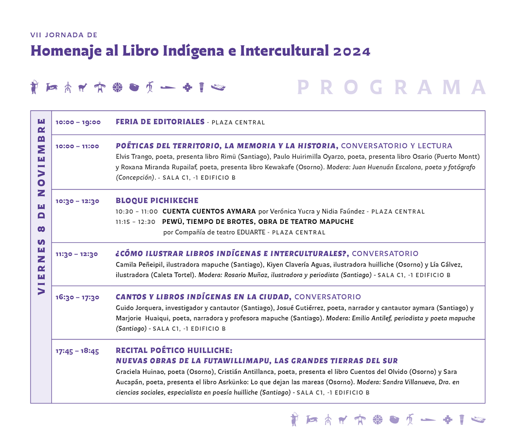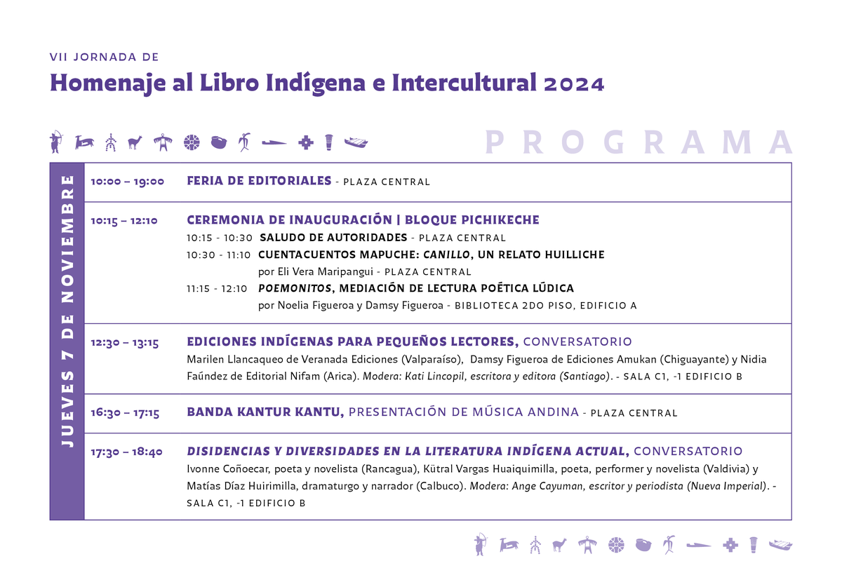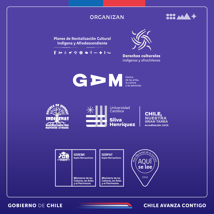 La VII jornada del Homenaje al Libro Indígena e Intercultural es organizada por el Plan de Lectura de la Seremi de las Culturas, las Artes y el Patrimonio de la Región Metropolitana en colaboración con la Sección Regional Metropolitana de la Subdirección de Pueblos Originarios del Servicio Nacional del Patrimonio Cultural (SUBPO) y el apoyo de la Universidad Católica Silva Henríquez