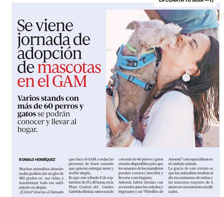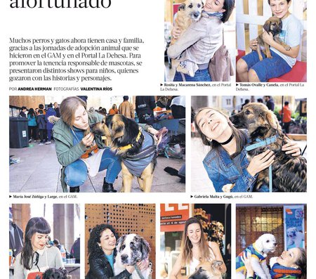 El domingo 06 de octubre, entre las 14 y las 19 h, se realizará una nueva jornada de adopción de mascotas en la plaza central de GAM.