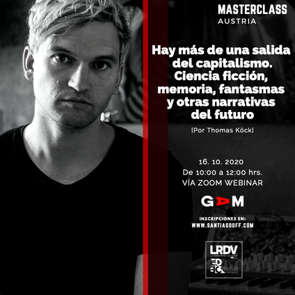 Thomas Köck hará un breve esbozo de los temas que lo han acompañado en su trabajo durante los últimos años y profundizar en los más recurrentes. El dramaturgo recorrerá junto a los estudiantes su camino para comprenderlo y ojalá llegar a un punto en común con los participantes, en el cual se relacionará el trabajo dramático con los grandes cambios y procesos históricos. Recorrerán juntos desde el final de la historia hacia hiperobjetos, falta de utopía, catástrofes, hasta textos corales/polifónicos y formas performativas musicales. Hablará un poco sobre huellas, cyborgs, fantasmas y formas de colaboración, que a su vez informan la estética.