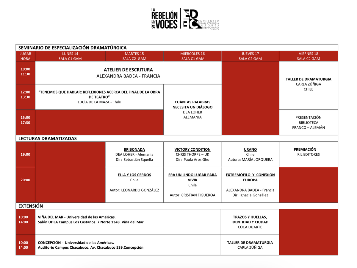 Entre las invitadas más importantes se encuentran; la dramaturga alemana Dea Loher, la francesa Alexandra Badea y el británico Chris Thorpe, además de las destacadas dramaturgas nacionales, Lucia de la Maza, Carla Zúñiga y Coca Duarte.
