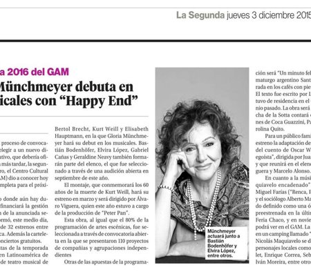 Posteriormente el elenco de Happy End, dirigido por Álvaro Viguera, cantó una pieza del montaje que se estrenará en Marzo en GAM y donde actúan Gloria Münchmeyer, Bastián Bodenhöfer, Gabriel Cañas, Elvira López y Geraldine Neavy, entre otros.