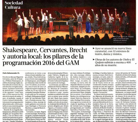 “Al igual que en temporadas anteriores, la programación se ha estructurado sobre la base de determinados énfasis que se complementarán con actividades de desarrollo de audiencias, como la conmemoración del cuarto centenario de la muerte de William Shakespeare y Miguel de Cervantes, el centenario del Creacionismo, los 50 años de danza independiente en Chile y los 60 años de la muerte de Bertolt Brecht”, detalla Javier Ibacache, director de Programación y Audiencias de GAM.