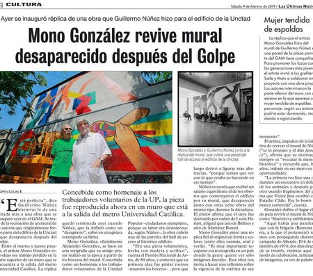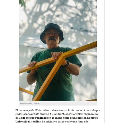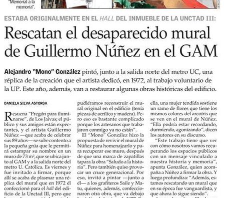 El homenaje de Núñez a los trabajadores voluntarios será revivido por el destacado artista chileno Alejandro “Mono” González, en un mural de 73.26 metros cuadrados en la salida norte de la estación de metro Universidad Católica. La iniciativa surge como una forma de recuperar espacios y memoria: “Este trabajo tiene que ver con cómo nosotros vamos recuperando los espacios públicos con un mensaje vinculado a nuestra historia y memoria. Se trata también de rendirle homenaje a un premio nacional de arte y de recuperar el imaginario de un mural que ya no existe”, cuenta González.