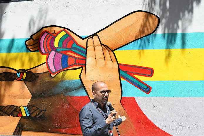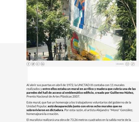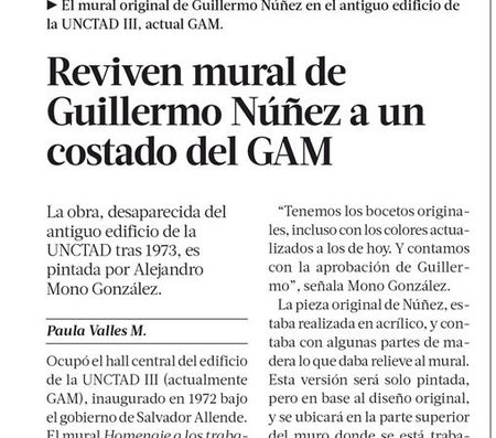 “En GAM permanentemente trabajamos para resaltar la memoria del edificio y, en este sentido, la colección de arte de 1972 es clave. Por eso decidimos, en conjunto con el artista Mono González, hacer este mural inspirado en una de las obras de la UNCTAD III. Este es el puntapié inicial de un proyecto de conservación y restauración de obras patrimoniales que realizaremos a partir de mediados de febrero”, cuenta Felipe Mella, director ejecutivo de GAM.