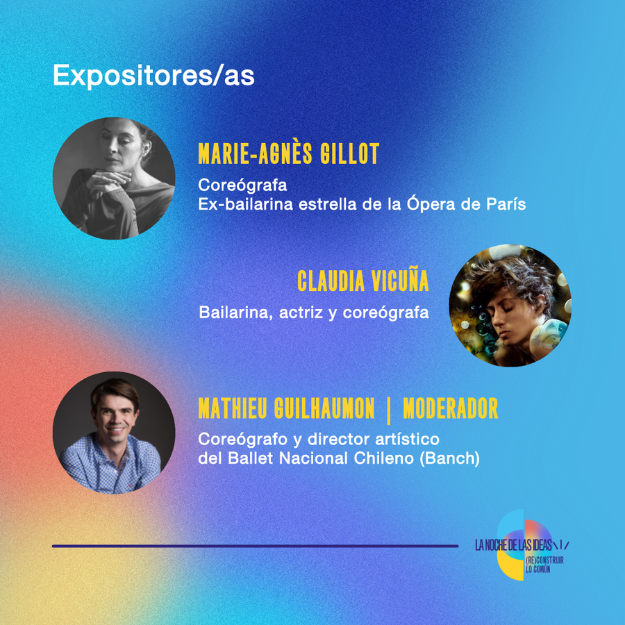 El diálogo que albergará GAM, será en torno a la experiencia de la bailarina y coreógrafa francesa Marie-Agnès Gillot, quien realizará una residencia creativa en Chile, y en esta mesa redonda dará testimonio de su reconstrucción y de su nuevo camino, tras una carrera como bailarina estrella en la Ópera de París en conversación a la coreógrafa chilena Claudia Vicuña.