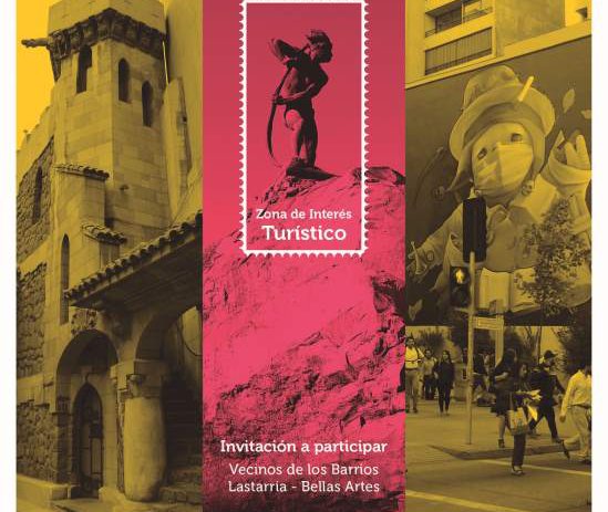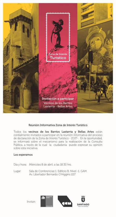 Subsecretaría de Turismo, Municipalidad de Santiago y GAM invitan a todos los vecinos de los barrios Lastarria y Bellas Artes a participar en la reunión informativa del proceso de declaración de la Zona de Interés Turístico ZOIT. En la oportunidad, se informará sobre el mecanismo para la realización de la Consulta Pública, a través de la cual la ciudadanía puede expresar su opinión sobre esta inicitaiva.
