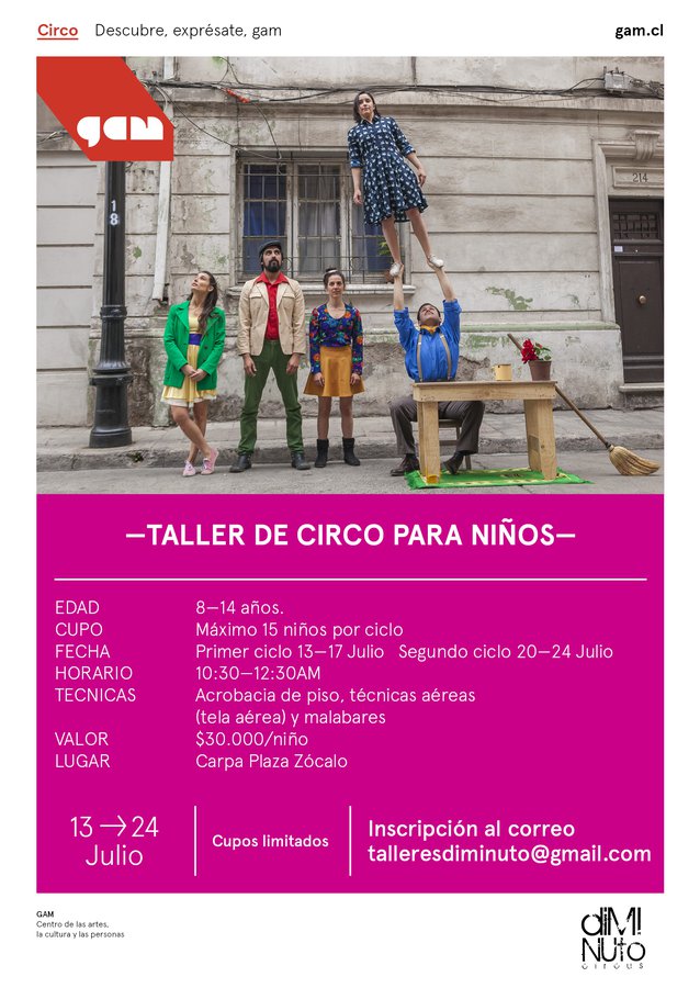 La compañía Diminuto Circus te invita estas vacaciones de invierno a un Taller de circo para niños. Se enseñarán técnicas de acrobacia de piso, técnicas aéreas (telas) y malabares.