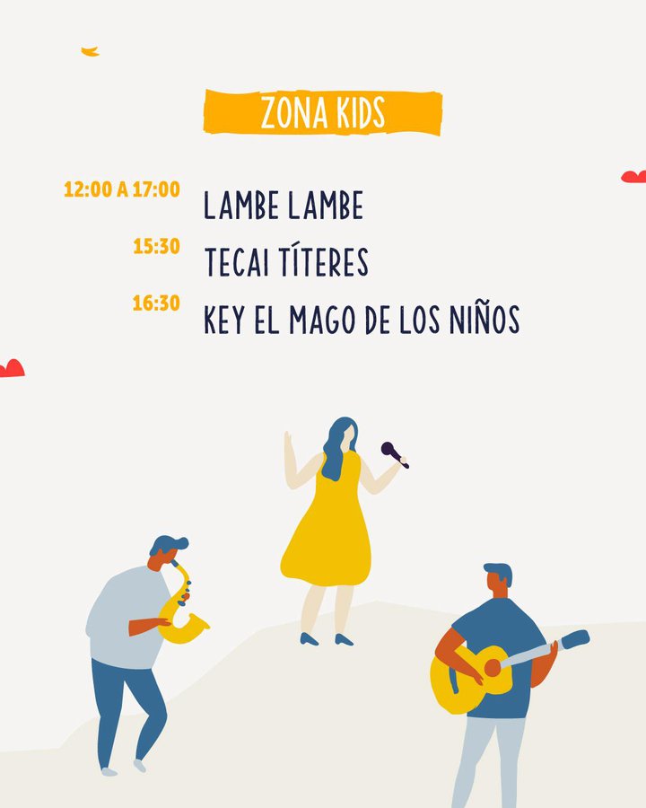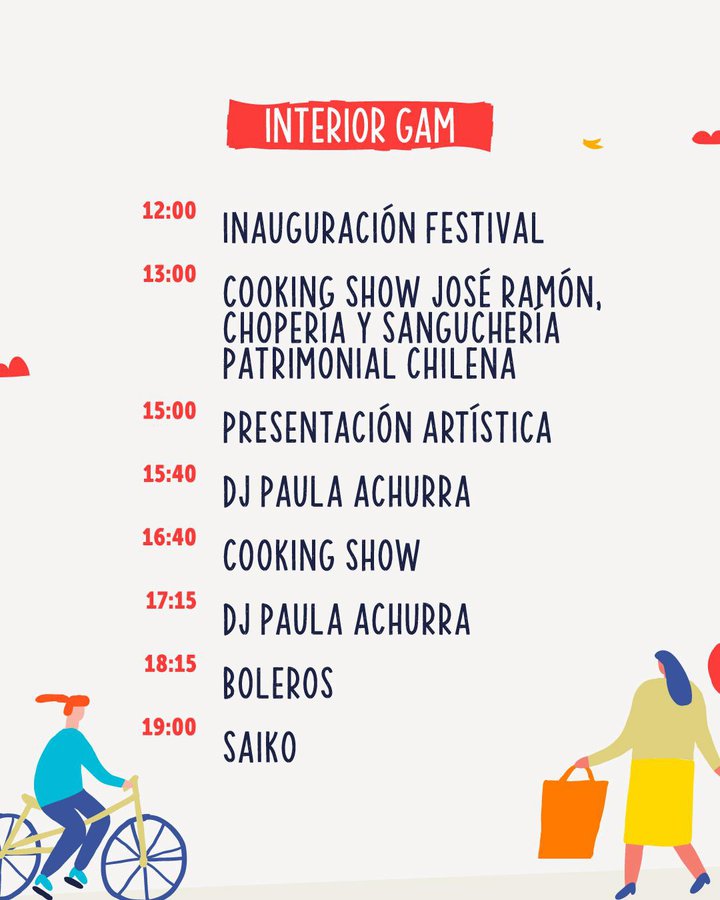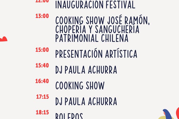 A eso de las 12, se desarrollará la inauguración del evento en la Explanada, frente a nuestra plaza central. A las 13 y 16.40 horas habrá show de cocina con José Ramón Chopería y Sanguchería Patrimonial Chilena. Posteriormente a las 15, una presentación artística y entre medio la música de Dj Paula Achurra. Para todo público, a las 18.15 horas se escucharán boleros antes de esperar el cierre final del grupo SAIKO que será en formato acústico.