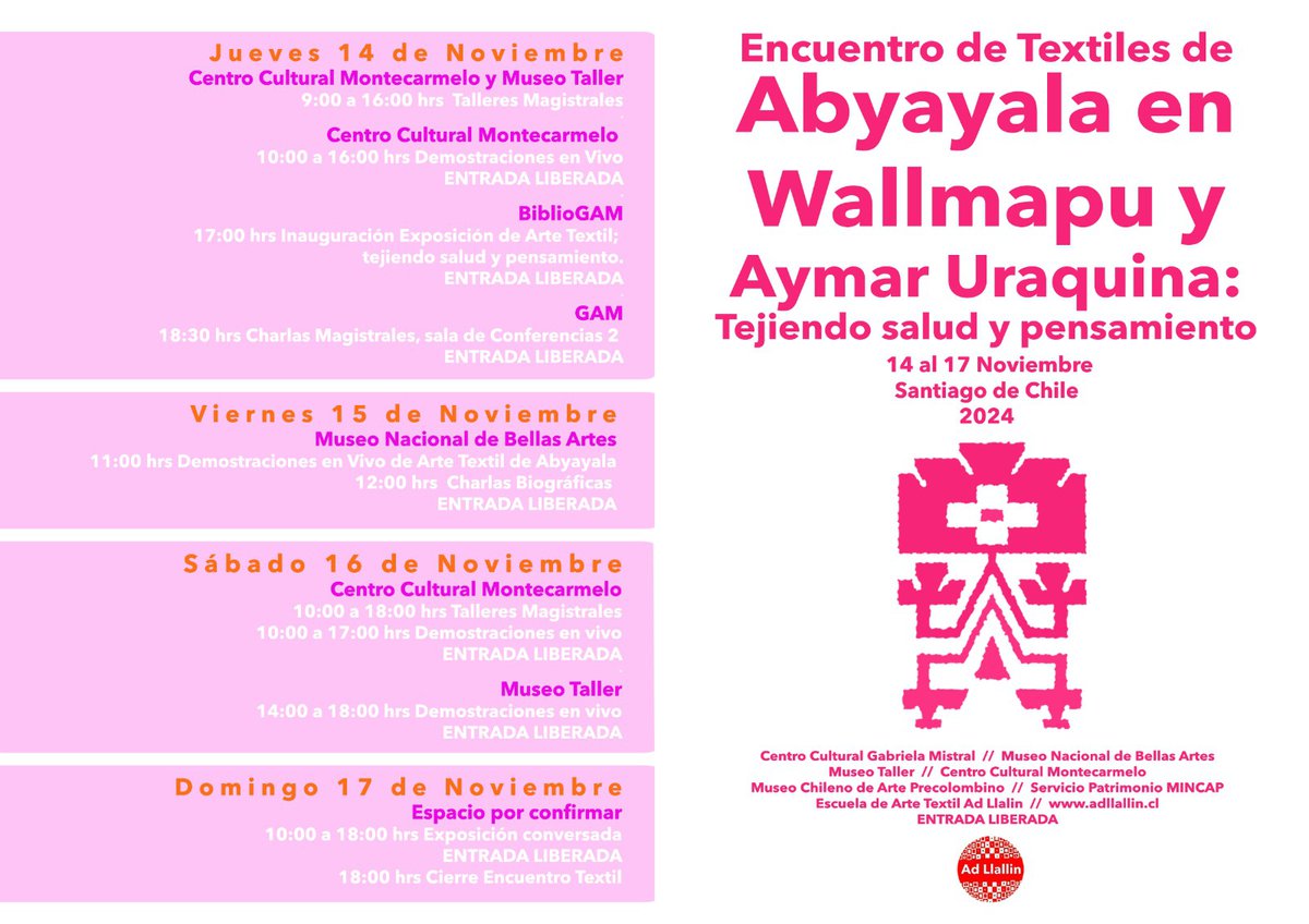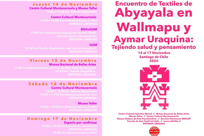 Una exposición que reúne a grandes exponentes del arte textil de pueblos-naciones originarias. Además de la exposición, habrá conferencias y encuentros en distintos lugares de GAM y Santiago para relevar a los artistas sanadores, generadores de salud y cuidados de pueblos originarios de Latinoamérica (Abyayala) a través del arte textil.