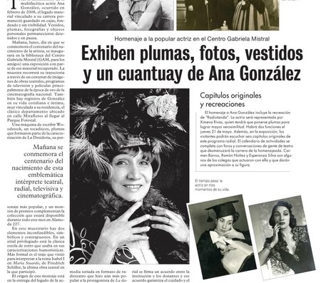 Este 4 de mayo Ana González cumpliría 100 años. GAM y ChileActores invita a celebrar su centenario con la exposición Ana González: 100 años. La muestra curada por Erika Araya incluye fotos y objetos personales de la actriz que fueron donados a GAM.