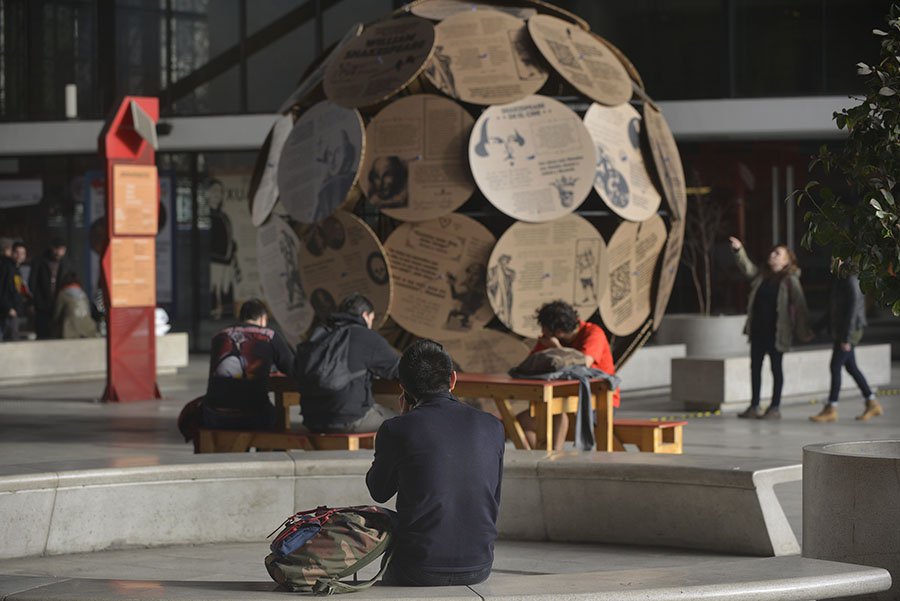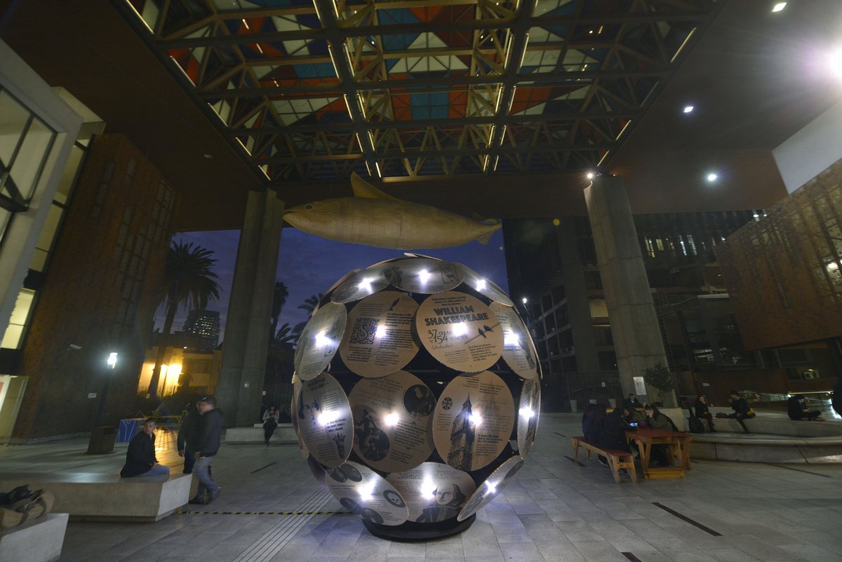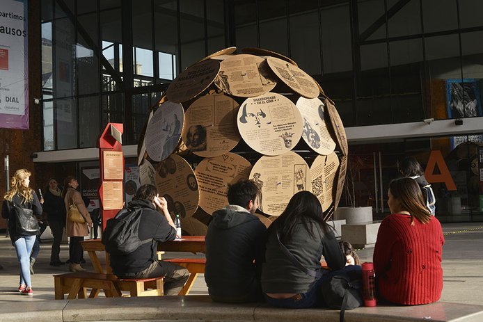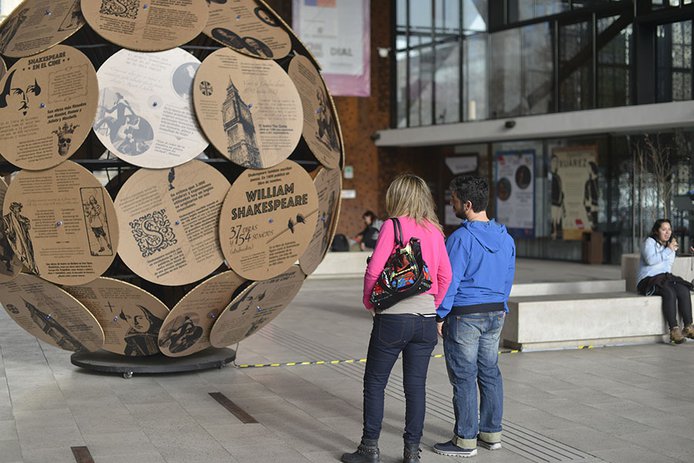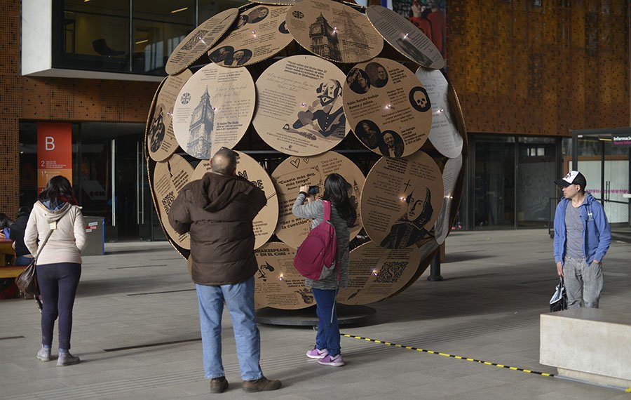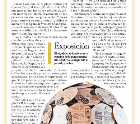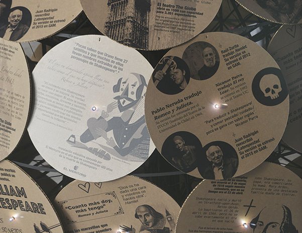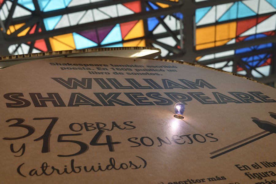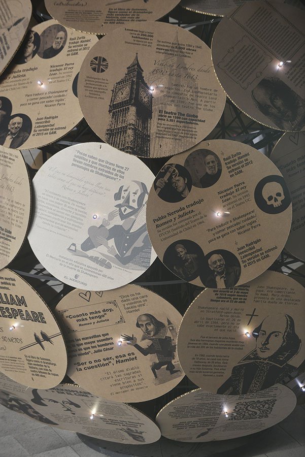 Una instalación hecha de cartón y fierro se expone en la plaza central del GAM. Contiene datos anecdóticos de la vida de William Shakespeare y algunas citas de sus obras más emblemáticas, como “Mira que a veces el demonio nos engaña con la verdad” de Macbeth, o el clásico “Ser o no ser, esa es la cuestión” de Hamlet.
