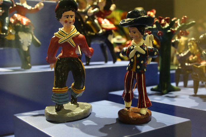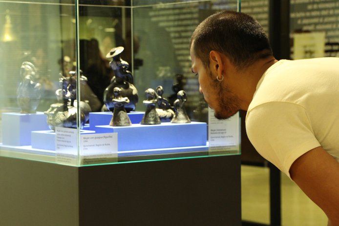 En las vitrinas destacan vasijas antropomorfas con esmalte vidriado de Cochabamba y Santiago de Machaca o las engobadas que representan músicos, elaboradas en el pueblo de Quinua; la cerámica negra de San Bartolo Coyotepec, Tobatí o Quinchamalí; y los minuciosos avatares cotidianos que representan las figurillas policromadas de Pernambuco, Santiago o Talagante, entre otros objetos.
