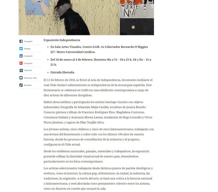 En 1818 se juró la independencia de Chile. A 200 años de este hecho, la muestra Independencia presenta una lectura de este bicentenario efectivo a través del trabajo de 10 artistas, centrado en hitos de los últimos 100 años.