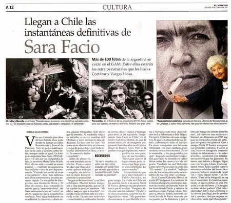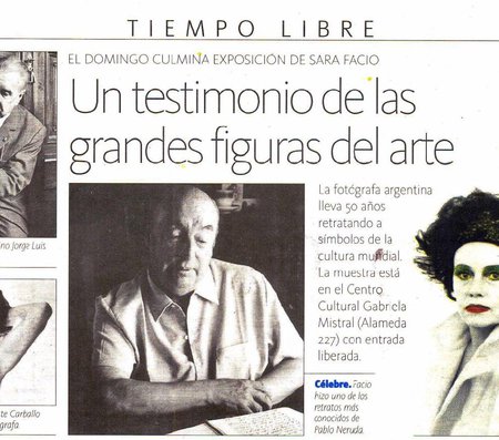 La primera retrospectiva chilena sobre su obra reúne en GAM 141 fotografías, principalmente retratos de personajes fundamentales en la cultura latinoamericana del siglo XX. Entre 1960 y 2005, Facio fotografió a escritores como Gabriel García Márquez, Juan Rulfo, María Elena Walsh, Octavio Paz, Ernesto Sábato, Juan Carlos Onetti, Alejandra Pizarnik, Isabel Allende, Julio Cortázar, Jorge Luis Borges, Nicanor Parra y Mario Vargas Llosa, entre muchos otros.