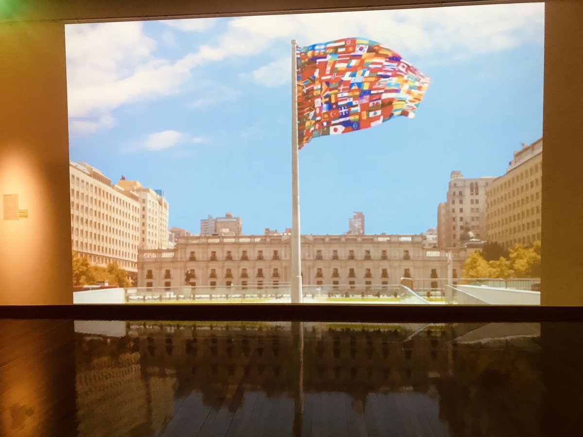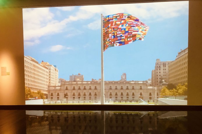 Una bandera formada por todas las banderas, salvo la chilena, flamea frente a La Moneda. Este video de Iván Navarro es parte de Santiago: ciudad destino, exposición que presenta a los movimientos migratorios como eje central de los cambios sociales y a la ciudad como plataforma de encuentro.