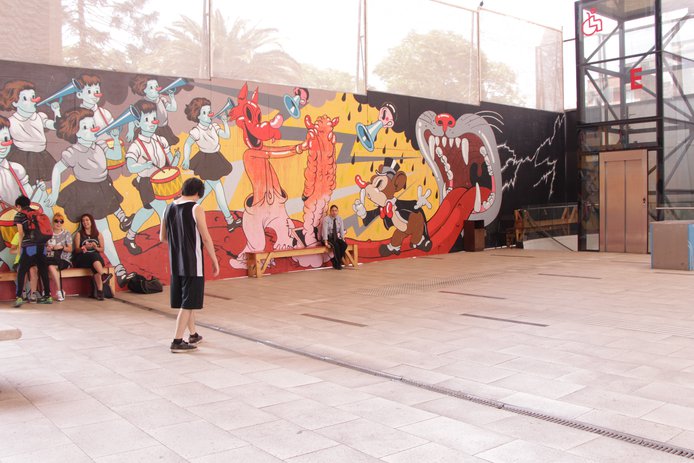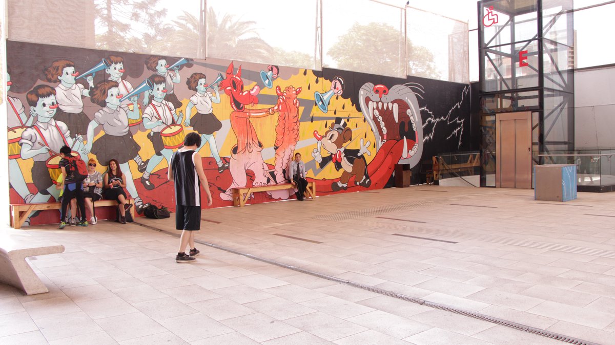“Utilicé imágenes extraídas de dibujos animados y antiguas caricaturas a modo de collage, para construir una escena narrativa. El humor y la ironía forman parte importante de mi trabajo. Se trata de unas fauces enormes que parecen engullir todo en cuya larga y extensa lengua se desarrollan distintas escenas que se conectan entre sí. Jóvenes marchando en lo que parece un carnaval o una protesta, un lobo vistiendo un traje de cordero, un ratón que representa a los más ricos pidiendo silencio entre tanto alboroto. Todo inspirado en los cambios e inquietudes sociales que veo presentes en el chile actual y que también son parte de una crisis social y económica global. Es el sistema que se niega a cambiar frente a los movimientos sociales, mientras los políticos visten para la ocasión ocultando sus verdaderas intenciones y los dueños del capital se niegan a escuchar. El mural es una visión tragicómica del contexto contemporáneo y una invitación para brindar mayor libertad de creación para nuestros brillantes jóvenes.”