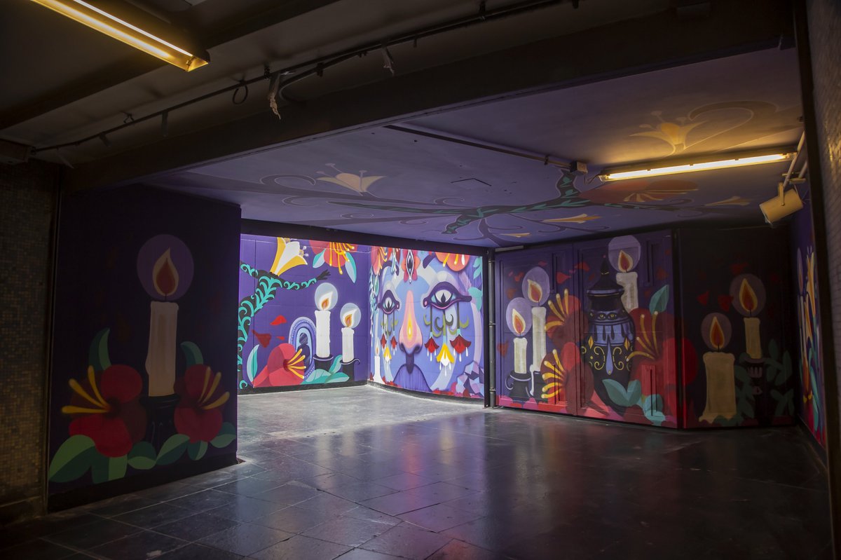 “Me inspiré en el poema Dame la mano y danzaremos de Gabriela Mistral, que habla sobre la danza y también sobre la unión de las mujeres para que generen un solo movimiento. Se representa a mujeres disfrazadas de flores danzando hacia la conciencia, situada en el muro central del metro, haciendo un llamado a la reflexión de nuestras propias acciones. Una de las flores más presentes es la añañuca, originaria del desierto de Chile, que representa la ausencia y presencia, y que según la leyenda, tiene una connotación muy mágica y de memoria.”