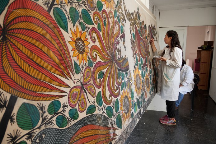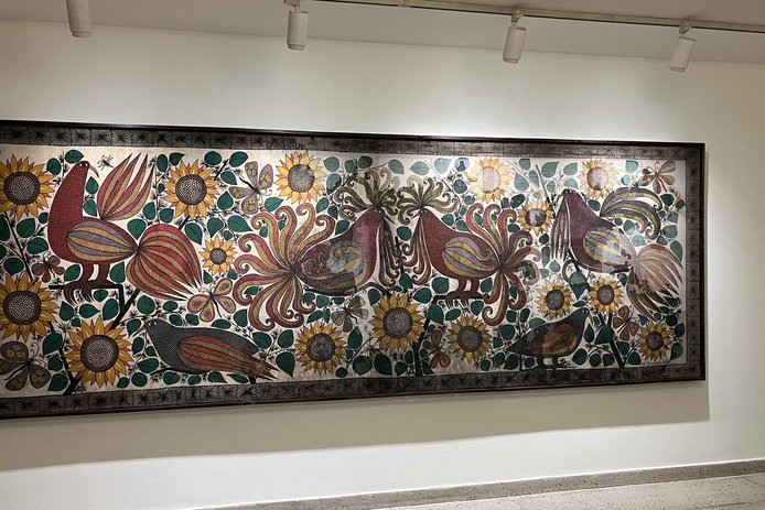 Creada para el Salón de delegados del edificio de la Unctad III en 1972 esta obra fue restaurada en el año 2023 con tintes originales encontrados en el taller del artista.