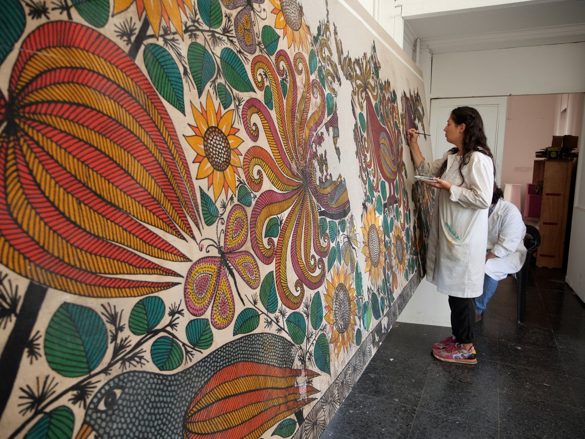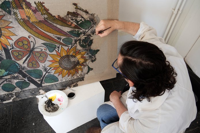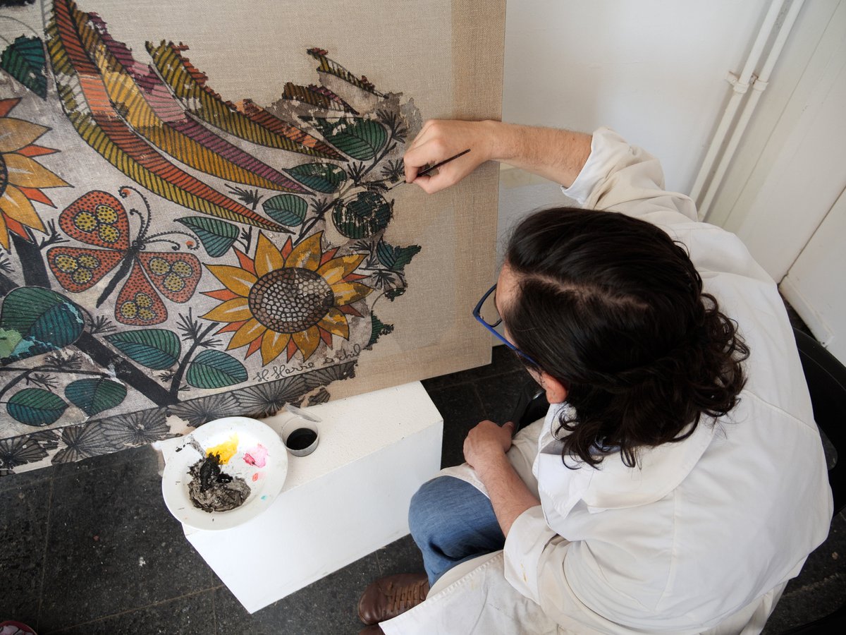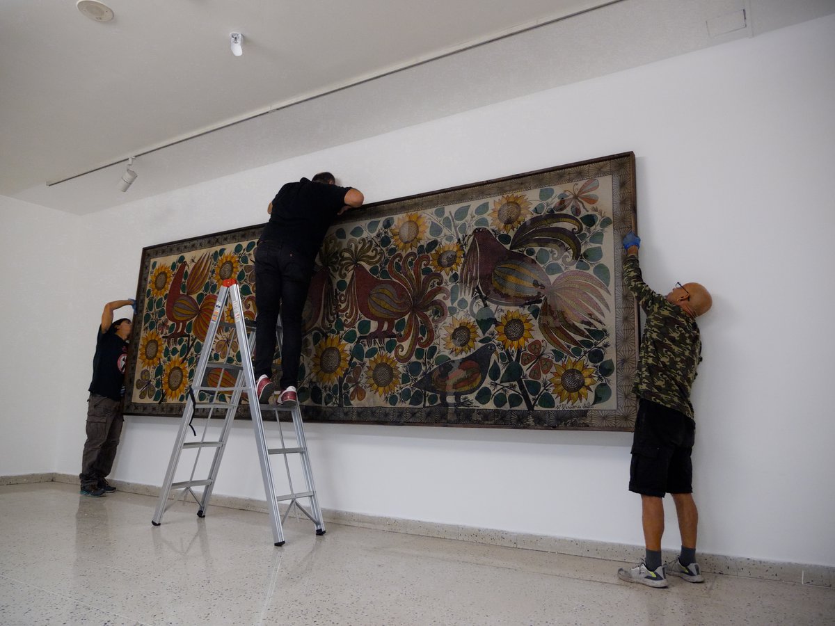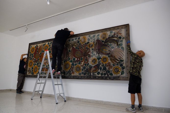 “Fue un regalo maravilloso que nos permitieran acceder a los materiales originales con que Héctor Herrera hacía su obra. Y fue un desafío también poder enfrentar la limpieza del textil, porque lo hicimos en seco, pero aún persistían las manchas y decidimos lavarla. Finalmente, eso permitió recuperar la obra”, cuenta Carlos Sotelo, parte del equipo que la recuperó.