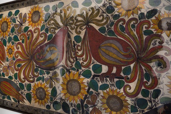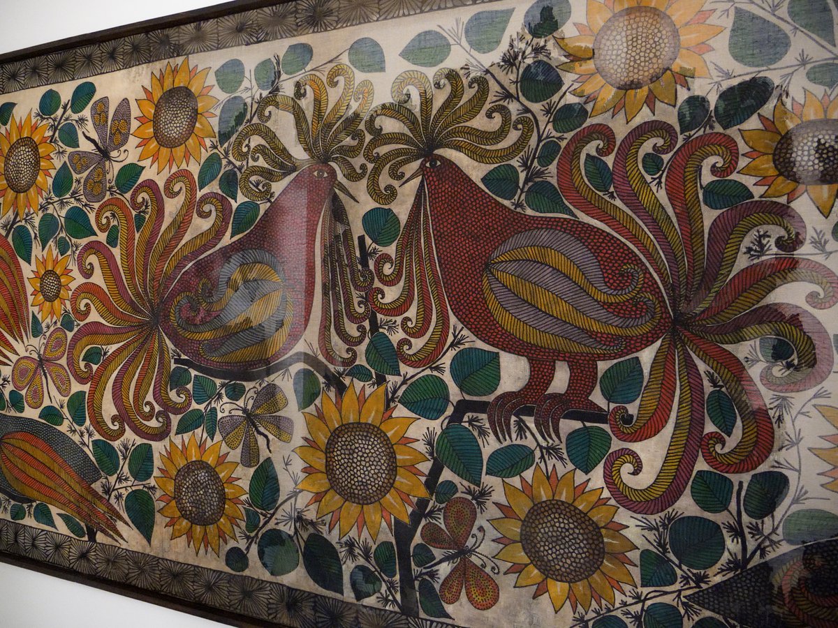 En el imaginario de Herrera los pájaros y las flores siempre destacan por su abundancia y generosidad sin dejar espacios vacíos y permitiendo que figura y fondo se unan en perfecta armonía.