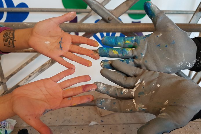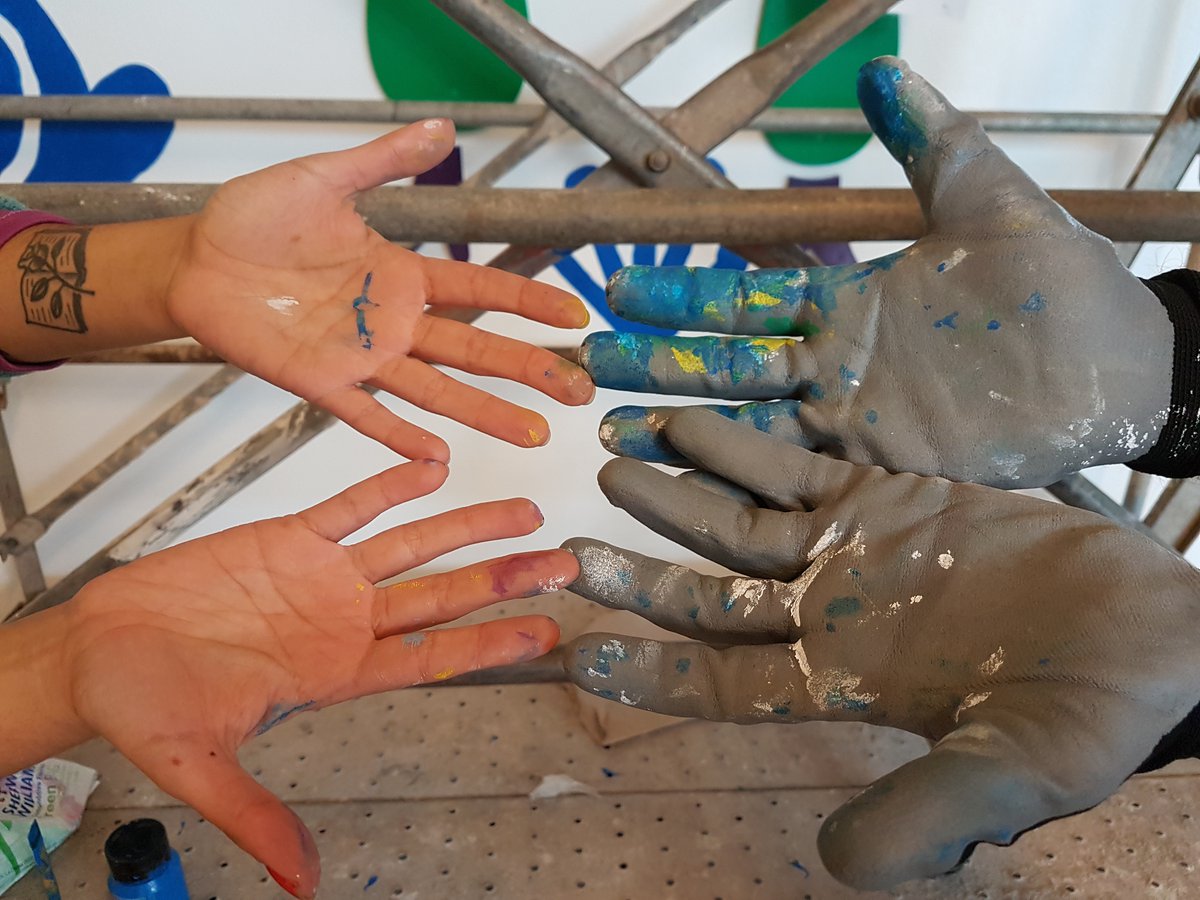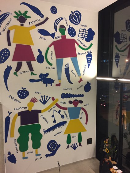 Los ilustradores, con gran experiencia en metodologías participativas, orientaron el trabajo de los niños y compusieron el mural proyectando sus dibujos en gran formato para darles armonía como conjunto. Fue un trabajo completo, desde los dibujos pequeños e individuales de cada niño, hasta conseguir la creación conjunta de un gran dibujo plasmado en un rollo de papel.