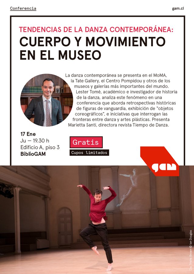 La danza contemporánea se presenta en el MoMA, la Tate Gallery, el Centro Pompidou y otros museos y galerías más importantes del mundo. Lester Tomé, académico, investigador de historia de la danza, analiza este fenómeno en una conferencia que aborda retrospectivas históricas de figuras de vanguardia, exhibición de "objetos coreográficos", e iniciativas que interrogan las fronteras entre la danza y artes plásticas. Presenta Marietta Santi, directora de la revista Tiempo de Danza.