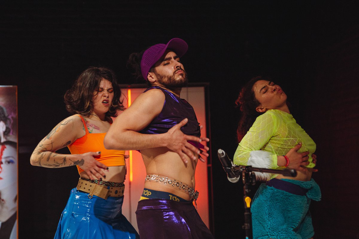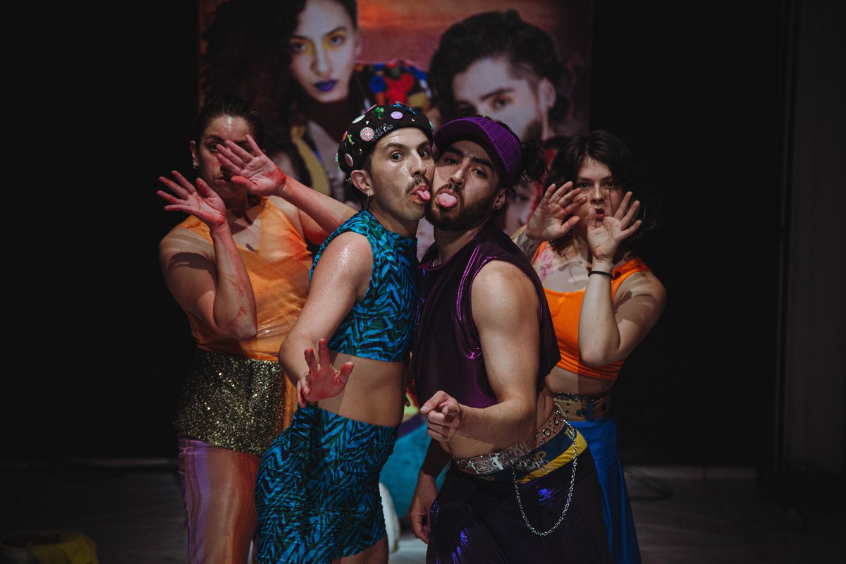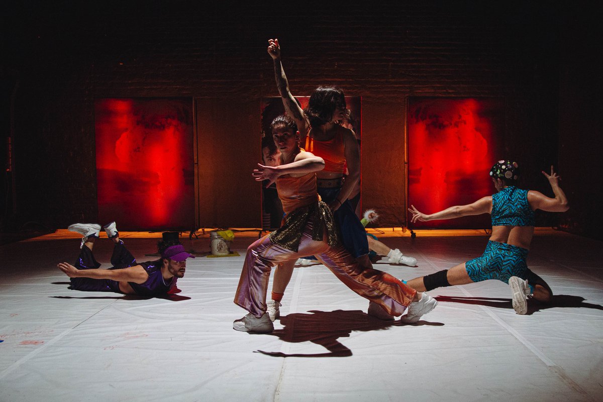 Entre bailes placenteros y recordados, los intérpretes rozan el teatro, utilizando recursos escénicos que enfrentan a la danza contemporánea con la representación. Todo eso, dentro de una suerte de set de televisión o estudio que nunca termina de construirse y que refleja la ironía de las relaciones humanas incapaces de convivir, cruzado por las pantallas de los años 2000.
